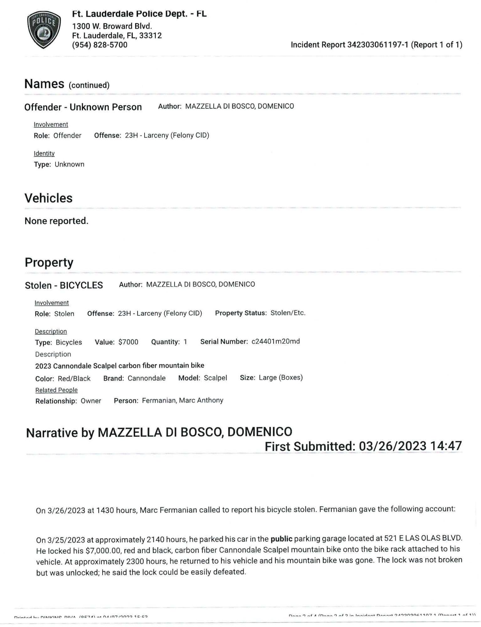 Parked at Garage with Cameras and on back of SUV on Bike Rack. Stolen on 03/18/2023 from Lanier Parking System 521 E. Las Olas Blvd. Fort Lauderdale, Florida. There was video cameras in the Public Garage.