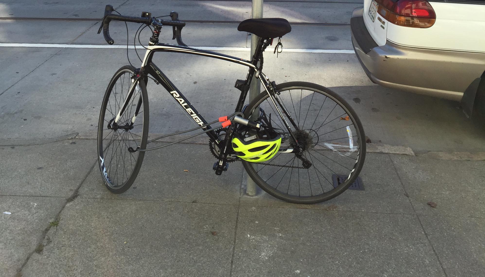 The bike was locked up at the bike rack in the parking lot behind the TechSoup Global office building on Brannan Street. I lock the bike there every day and this is the first problem I have had. It was locked with the U-Lock around the back tire and frame, connected to the cable which was through the front wheel and the bike rack.