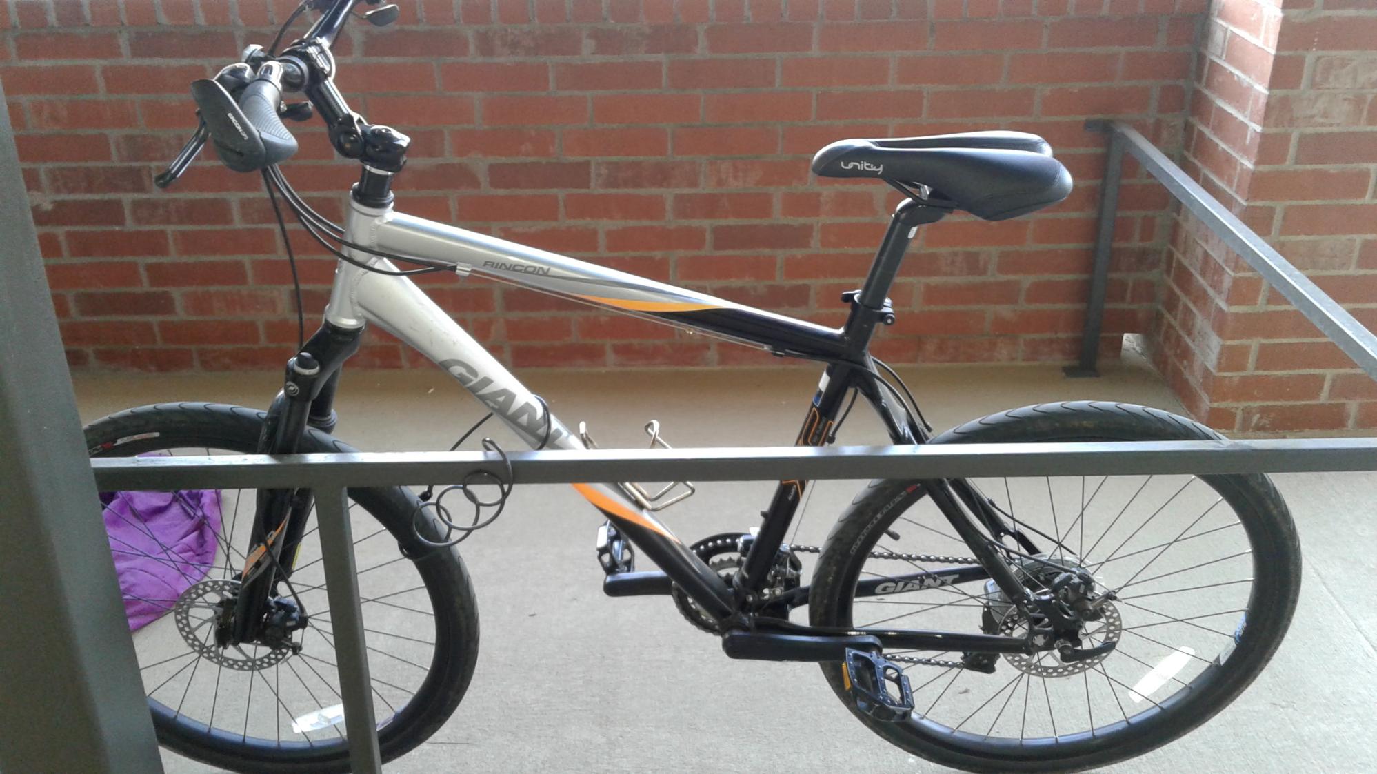 Bike was secured with a cable lock on a metal bar under the stairs right outside my door.