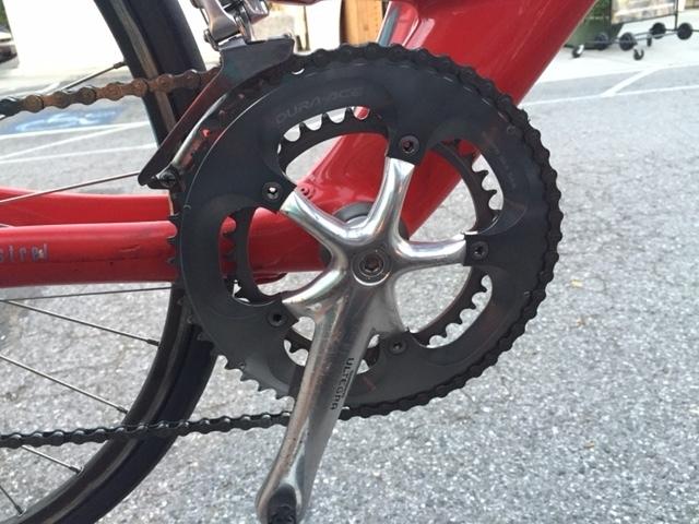 The bike is a Kestrel, painted red w/white writing (see pics). white shimano clip in pedals, white tape handlebars, black profile design aerobars. Wheels are smaller size (650), and Ultegra front chain wheel. There is probably some black smudge on the back of the frame.