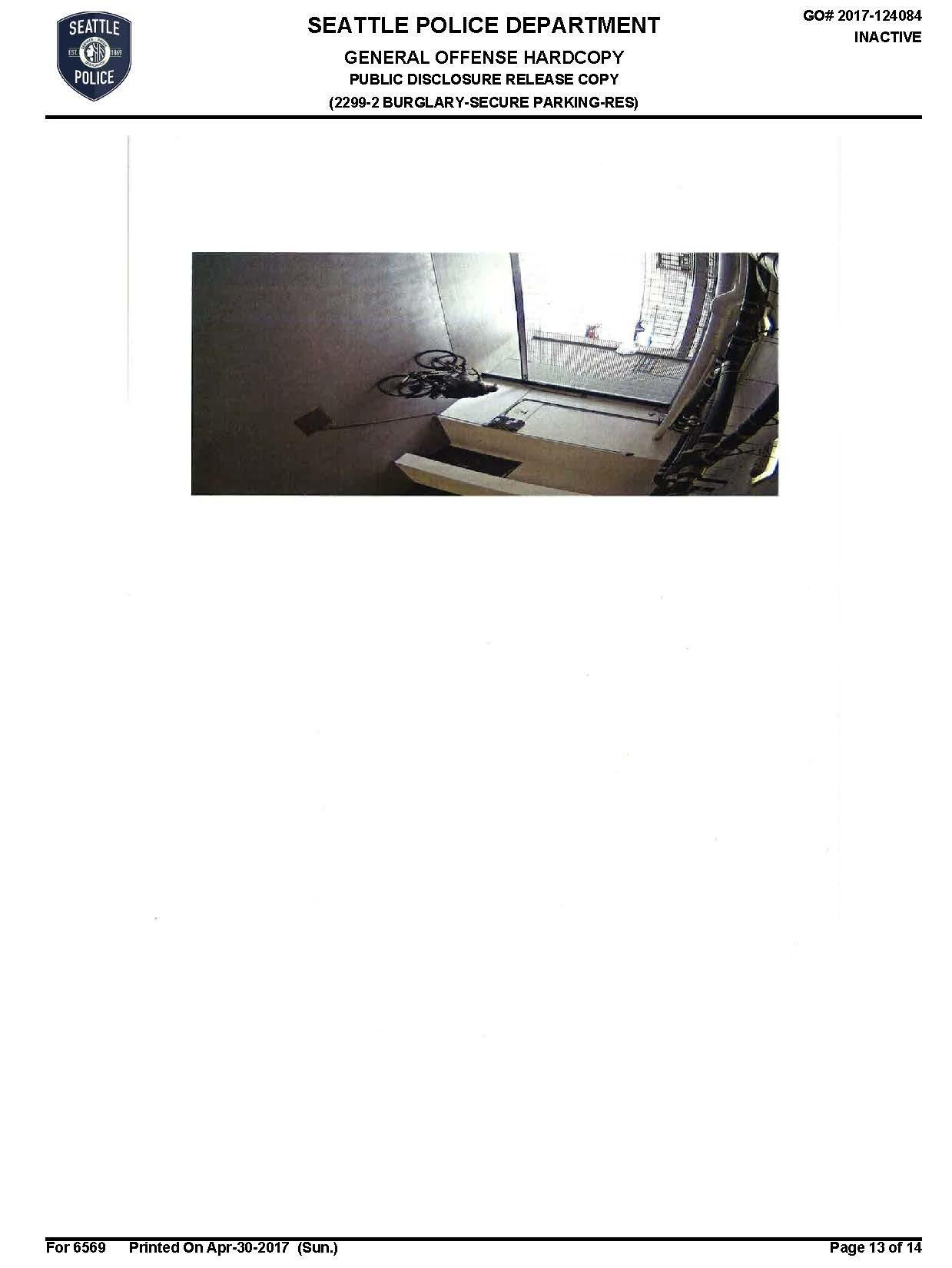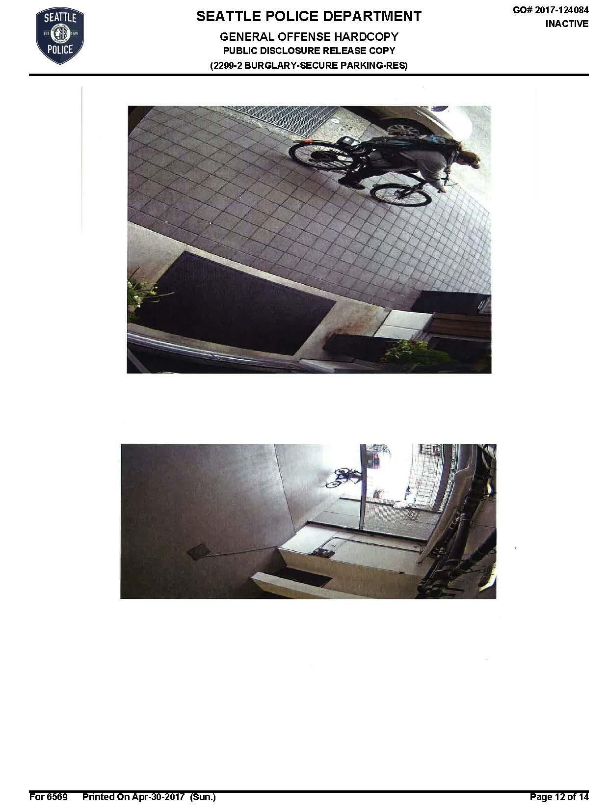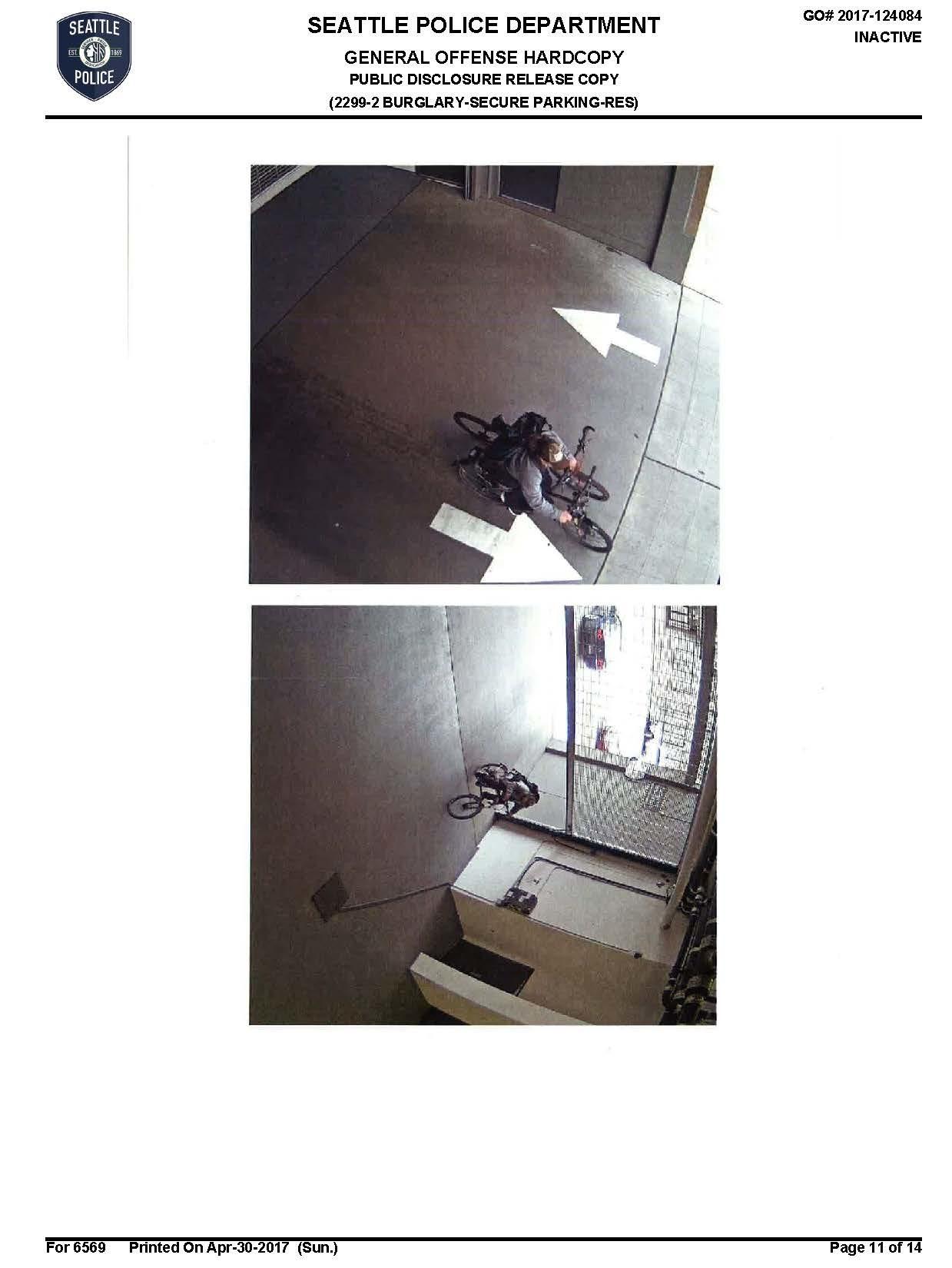 15 INITIAL INCIDENT DESCRIPTION / NARRATIVE: On 04-09-2017 I was on routine patrol working in full Seattle Police Department uniform in a marked, two-officer patrol vehicle assigned as unit 2D2 with Officer Beecroft 7722. At 1357 hours I logged to a call of a burglary that occurred at 583 Battery St; Insignia Condos. The call stated: NORTH TOWER/INV NON FORCED BURG INTO SECURE PARKING GARAGE AND SUBSEQUENT BICYCLE THEFT... OCCURRED AT 1138 HRS...THERE IS A SECURITY VIDEO AVAIL FOR OFFICERS TO VIEW...SUSPECT LEFT UNK DIRECTION ON FOOT WITH BICYCLES...NO WEAPONS SEEN.. WHEN OFFICERS ARRIVE THEY CAN SPEAK WITH EMPLOYEE (removed).I arrived on scene and spoke with concierge (removed). She stated at approximately 1136 hours this morning she received a call at the front desk from a resident advising there was a suspicious subject inside the parking garage. The subject was on level UG of the parking garage which is one level above ground level. At 1138 hours, Jaffe stated she received another call from resident (removed) and her husband (removed) advising they just observed a suspicious individual exit the garage with two bicycles. (removed) stated after receiving these phone calls, she and other staff entered the garage on level UG where the suspect was observed. They located one cut bike lock on the ground near the bicycle storage area. (removed) was able to review surveillance with Officers which showed the suspect exiting the garage with two bicycles. (removed) was unable to locate on surveillance the suspect entering the garage so it is unknown if he entered with one bicycle or if he stole both bicycles from the garage. The suspect exits through the 6th Ave garage entrance.(removed) advised she has sent out a building-wide email advising individuals to check their bicycles in order to determine the victim in this incident. (removed) was provided with an SPD business card and case number before breaking contact and advised to have the victim call with further information regarding the stolen bicycle. (removed) did not have the ability to burn the surveillance footage but advised it is available on their software if needed. The suspect was described by witnesses (removed) and (removed) as a white male, 35-45, medium to heavy build, brown baseball hat, grey hoodie, black pants, black backpack, and black shoes with white soles. The garage entered is a secured garage requiring a garage door opener or electric key-fob in order to gain access. It is currently unknown how the suspect made entry into the building.