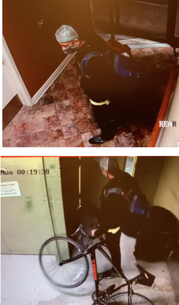 Bike was stolen exactly on July 11 at 12:19 am. The individual is a white male wearing dark pants and dark sweatshirt with a baseball hat that he wears backwards in two tones and what appears to be the logo of Firestone Walker brewery. He is also wearing Brooks sneakers. He was carrying a red Nike backpack and a blue one.