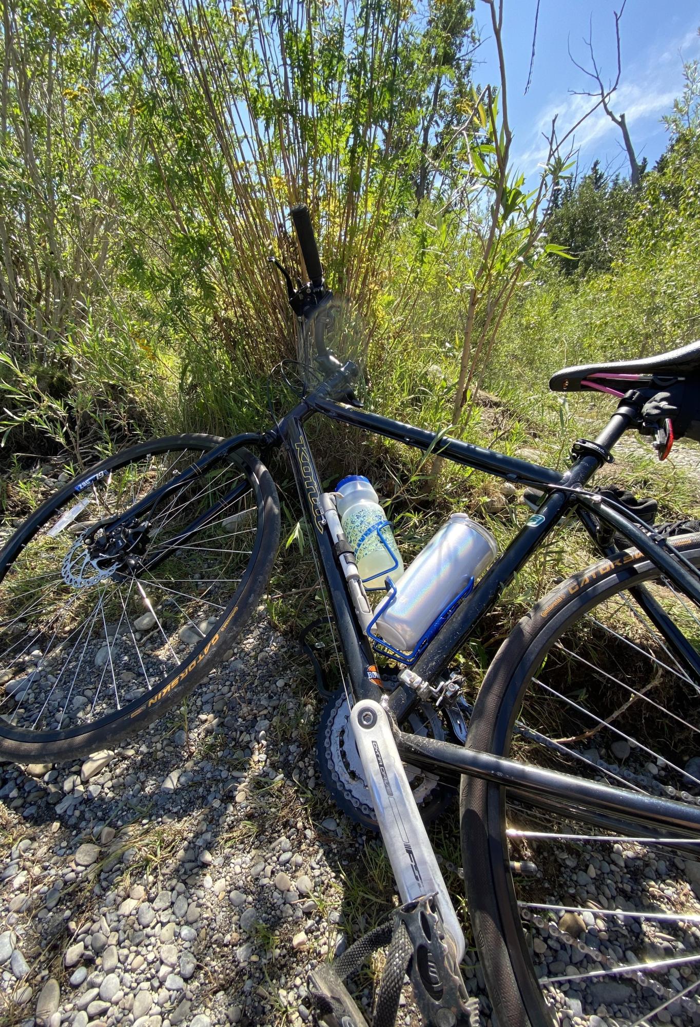 Bicycle frame is black with yellow accents (Kona logo etc...) has some paint scratches on the frame from prior accidents. 2x blue metallic water bottle holders, 700cc road tires, custom women's bike seat with pink breast cancer ribbon, under seat bag