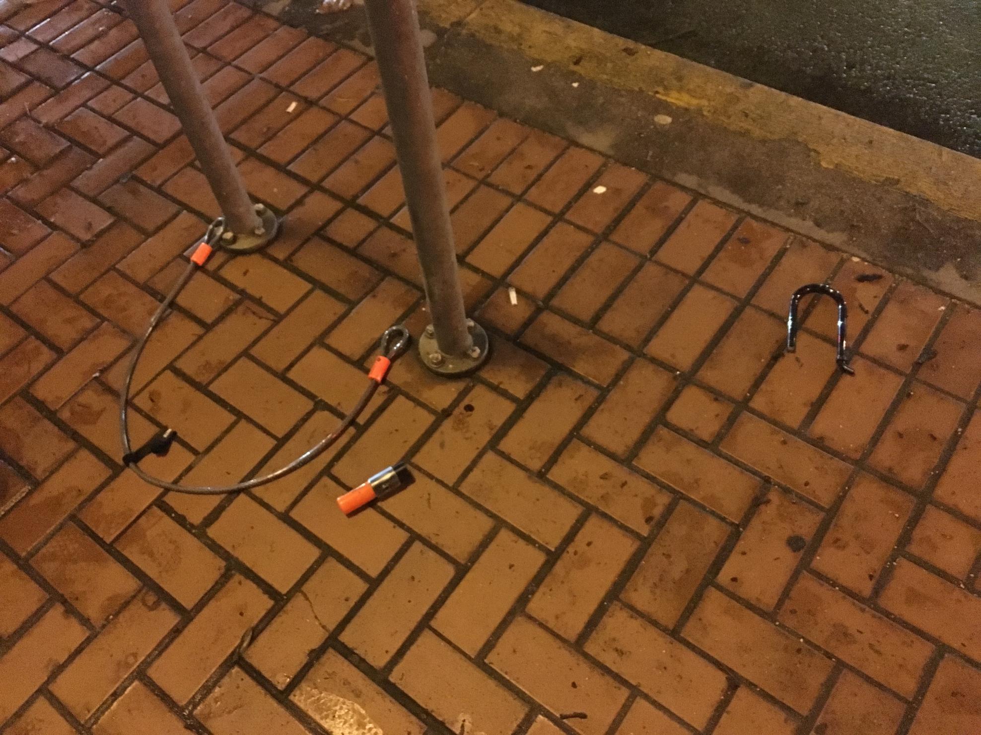 I biked to my destination, arriving ~6:25pm and locked my bike to a bike rack with a Kryptonite cable through my front wheel and a Kryptonite u-lock through my back wheel within the rear triangle. I exited the building ~9:00pm and saw that my bike was stolen. The u-lock had been cut, most likely by an angle grinder, and both the remnants of the lock and the cable were left on the ground beside the bike rack.