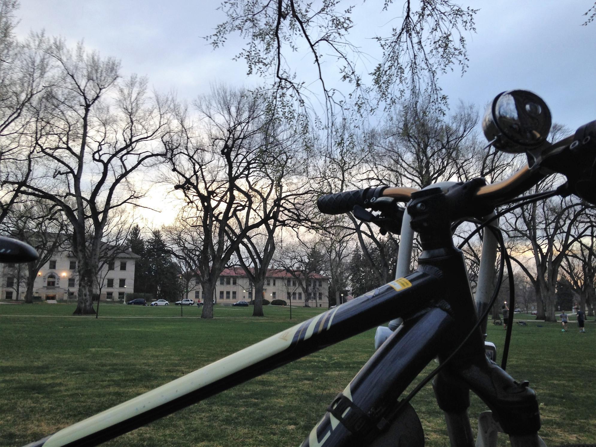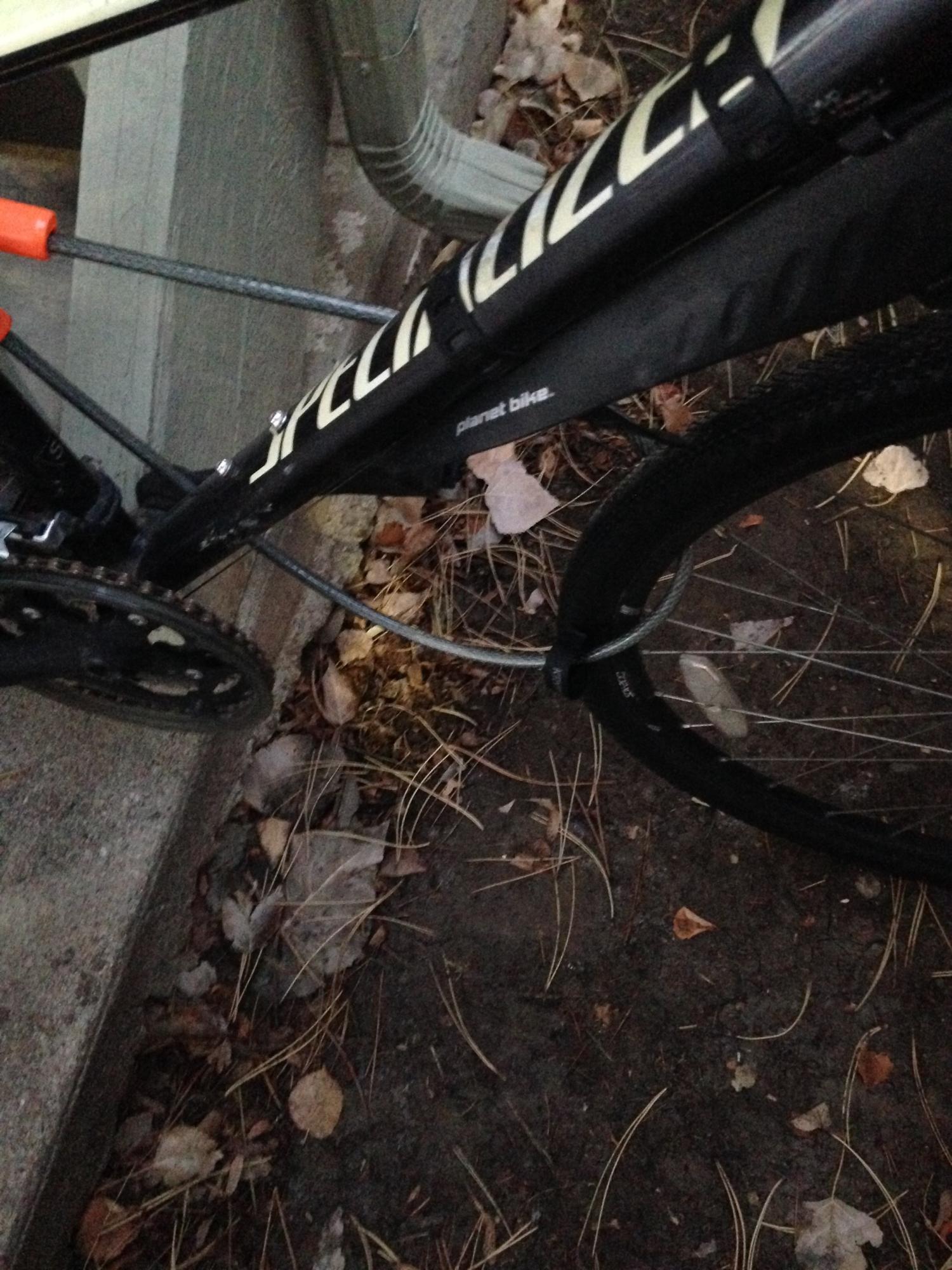 Arrived at home(apartment) at 7:30pm Friday April 14, with my bike on my bike rack, attached to my car, which was parked in the lot in my apartment complex. The parking lot is a cul de sac, blocked in with fences. The bike was locked with a cable lock, locked securely onto/through the bike rack, as well as secured with plastic zip tie attachments.