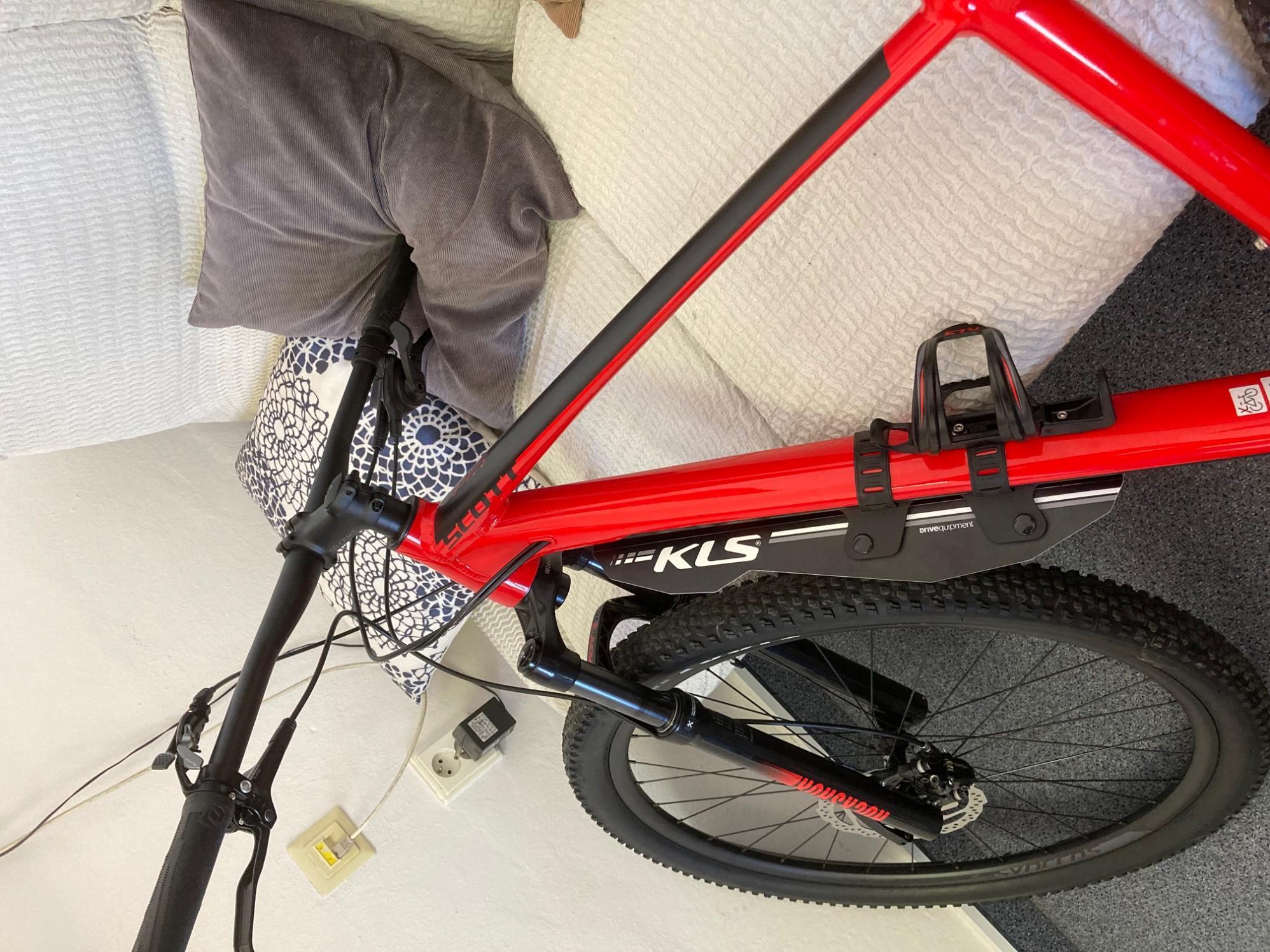 Červené horské kolo s pneumatikami MAXXIS a červené vidlice ROCKSHOX