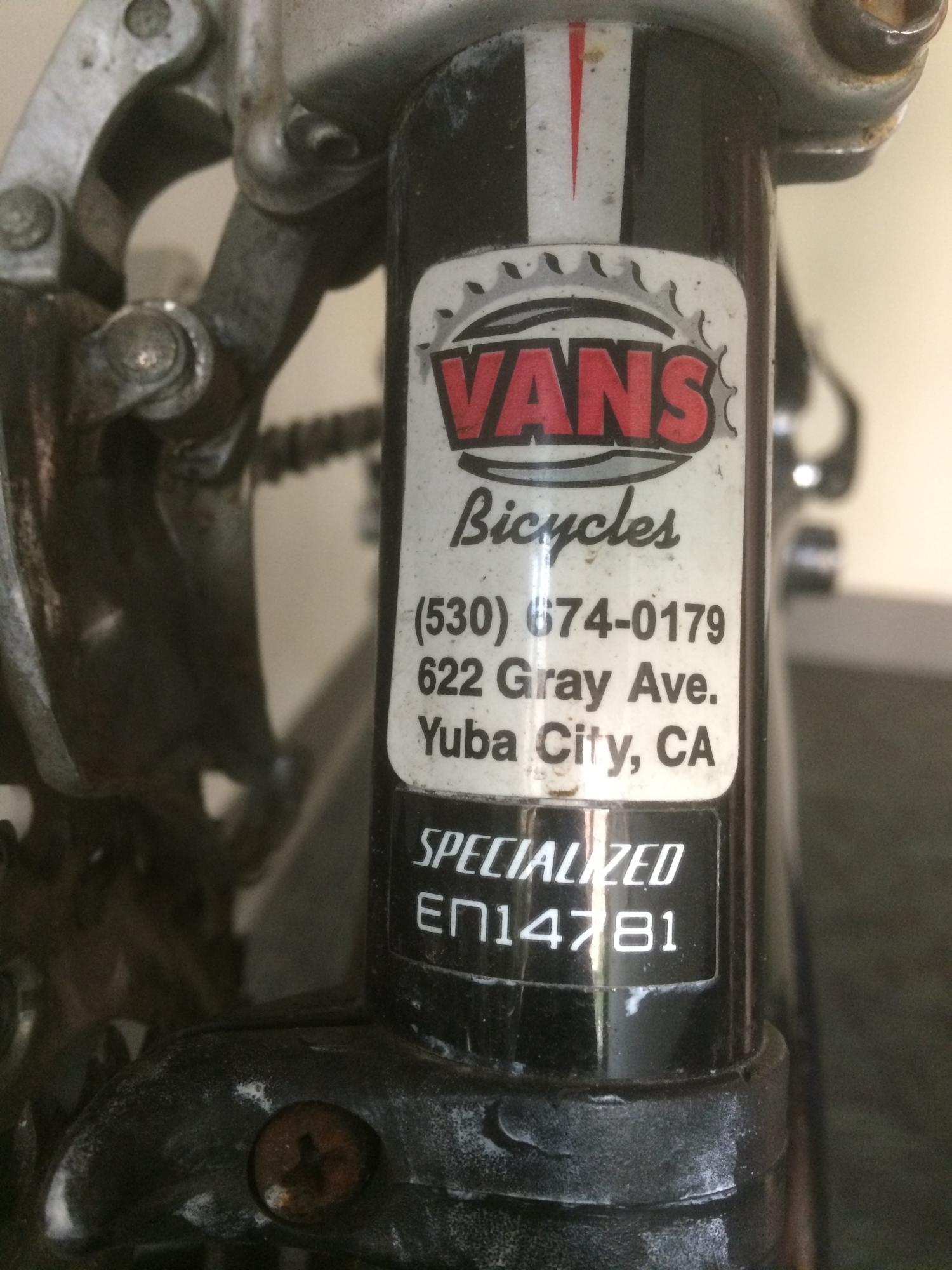 The Bike is a black w/ red/white stripes, XL, Specialized Allez Sport, 53.2x58 cm carbon frame, ID number EN14781, originally purchased from Vans Bicycles, 622 Gray Ave., Yuba City, CA. The bike was given to me in 2013 as a gift from the original buyer/owner. I have one of my business cards stuffed into one of the handlebar tubes; red grip tape; rims are 700mm Alexrims S500; tires are Gatorskin brand; I also have a wireless Cateye bike computer on the bike.