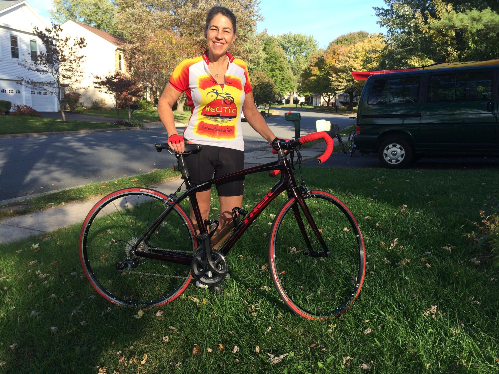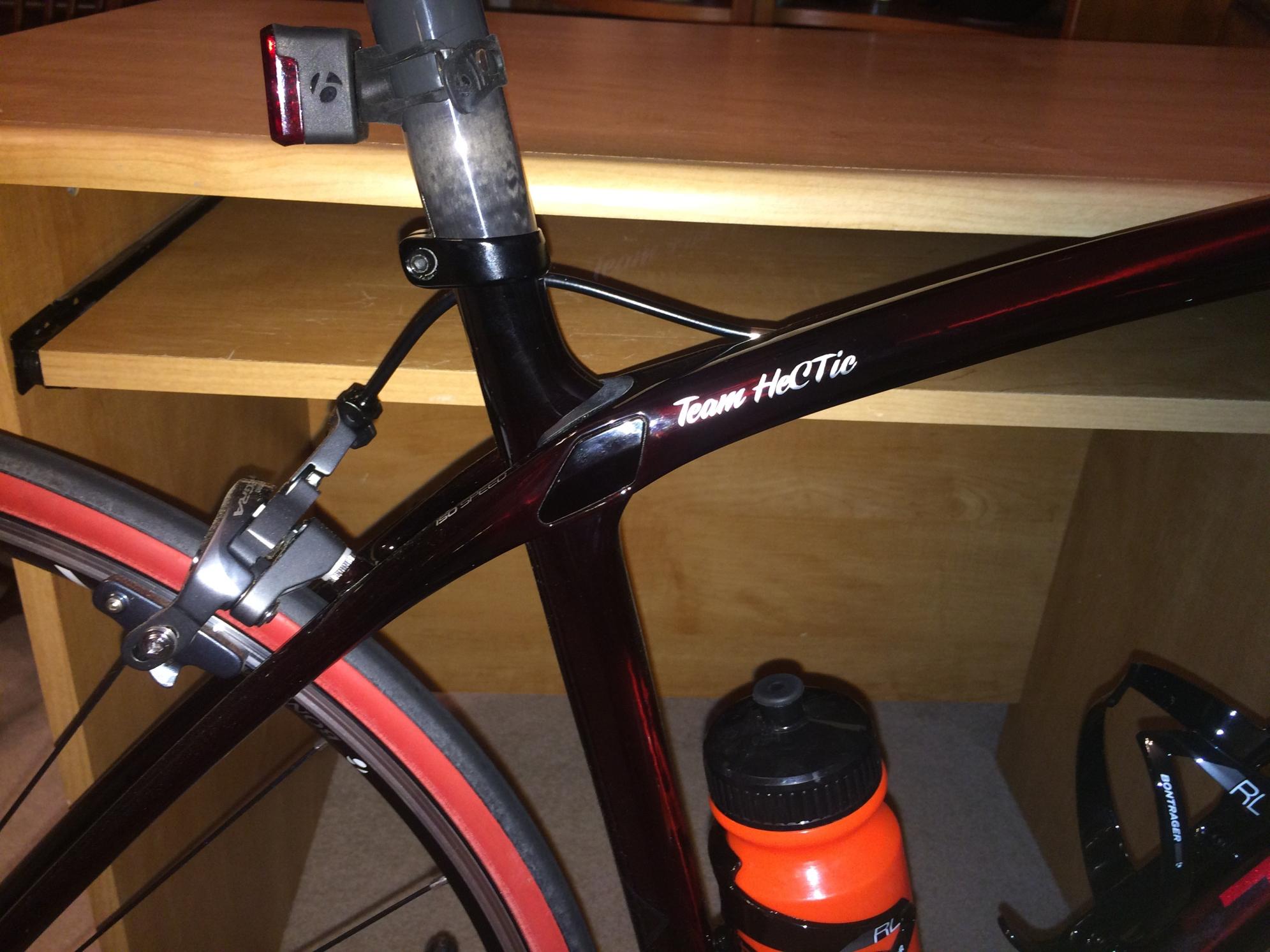 Locked in van, which was broken into overnight via shim or malfunctioning door latch. Everything was ransacked and cash stolen from change drawer. Items stolen besides bike were Ironman Lake Placid bag with bike gear including green helmet and shoes and Kelly Hansen raincoat. Bike has red bar tape, Adamo racing saddle, aerobars, Performance hydration system, red bento box, saddle bag with tubes, upgraded gears with goat link and 11-42 cassette, upgraded racing tires with black sidewalls, team name inscribed on crossbar (Team HeCTic), and The Bike Lane shop logo on downtube.