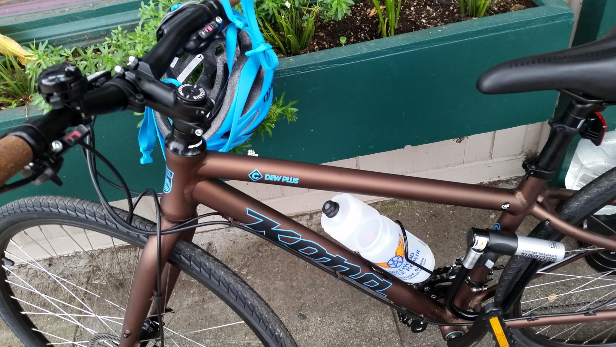 Bike was locked up and the lock was still connected to the wall. Was located in a secure locked garage. Brand new, only rode twice. Nubs still on the tires. Upgraded grips brown cork, blue lettering on the brown frame. Kona Dew Plus