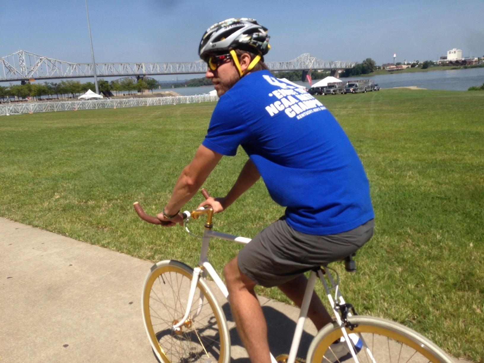 I locked my bike to the bike rack outside of Louisville Slugger Field in downtown Louisville at 7:30pm. I went in to attend the game and after game fireworks. It was when I came out that I noticed the bike was gone along with my helmet that I had locked to it as well. Most cable locks have a velcro strap that allows to wrap the cable when in transport and this was the only thing left that obviously fell off when the cable was cut.