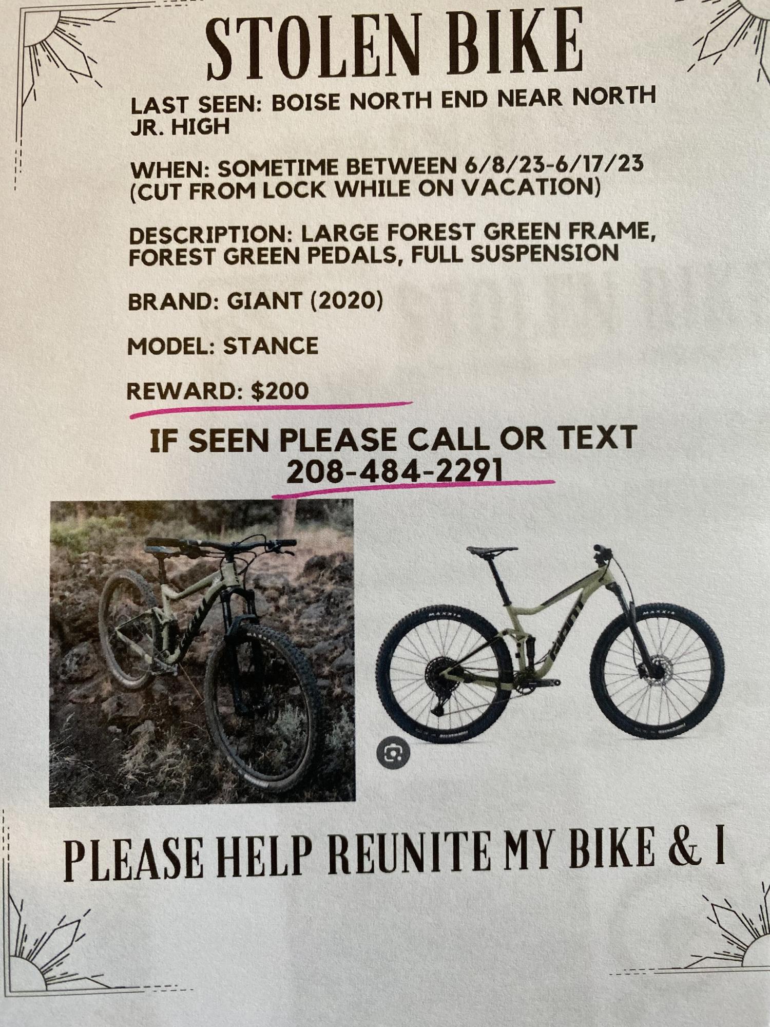 Came home from vacation (6/8-6/17) and bike was cut and stole from the side of my house near North Junior High. Bike was covered by a large tarp and was locked up.