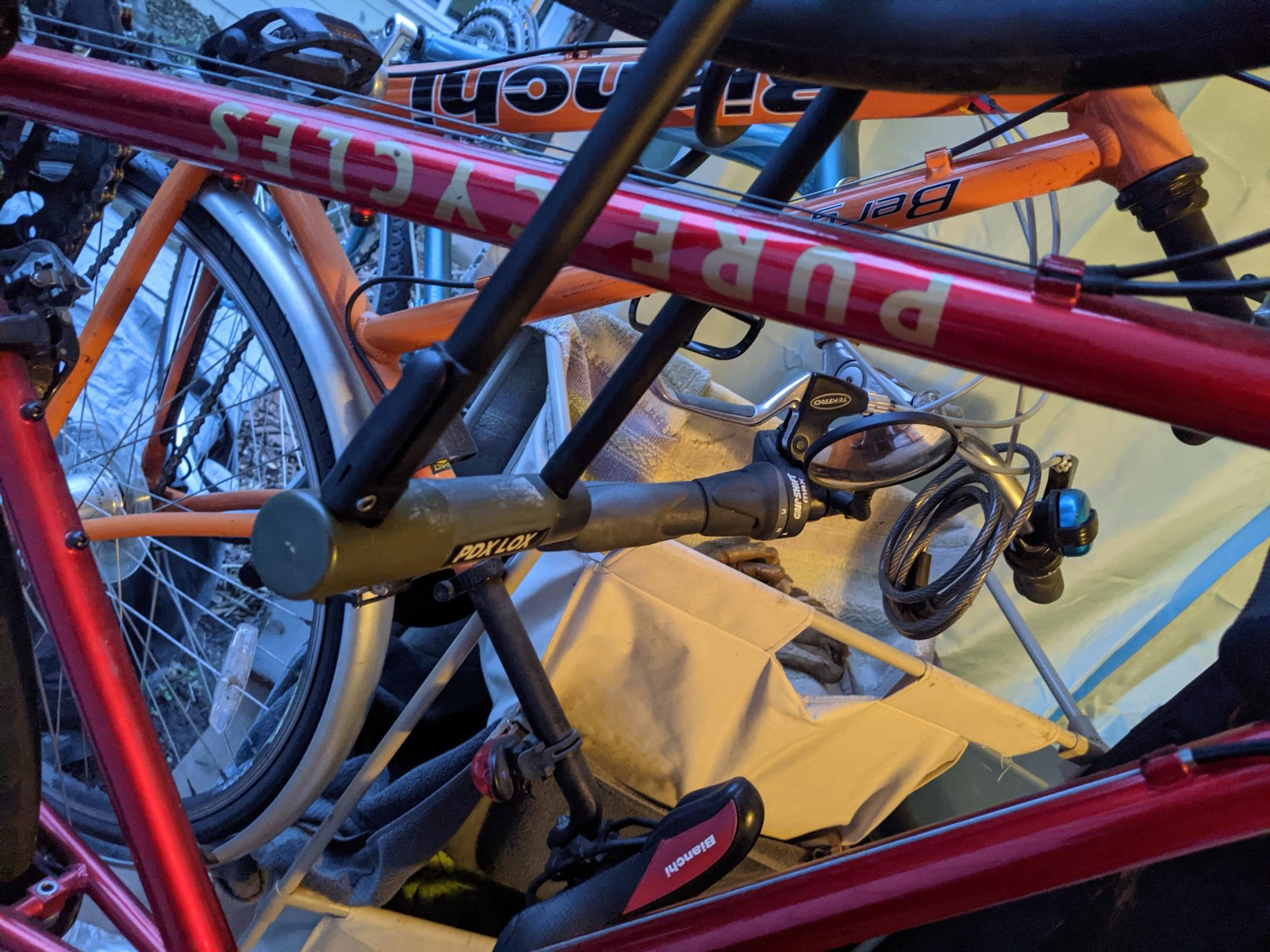 Taken from back porch seemingly with U-lock still attached. Locked to frame and front tire.