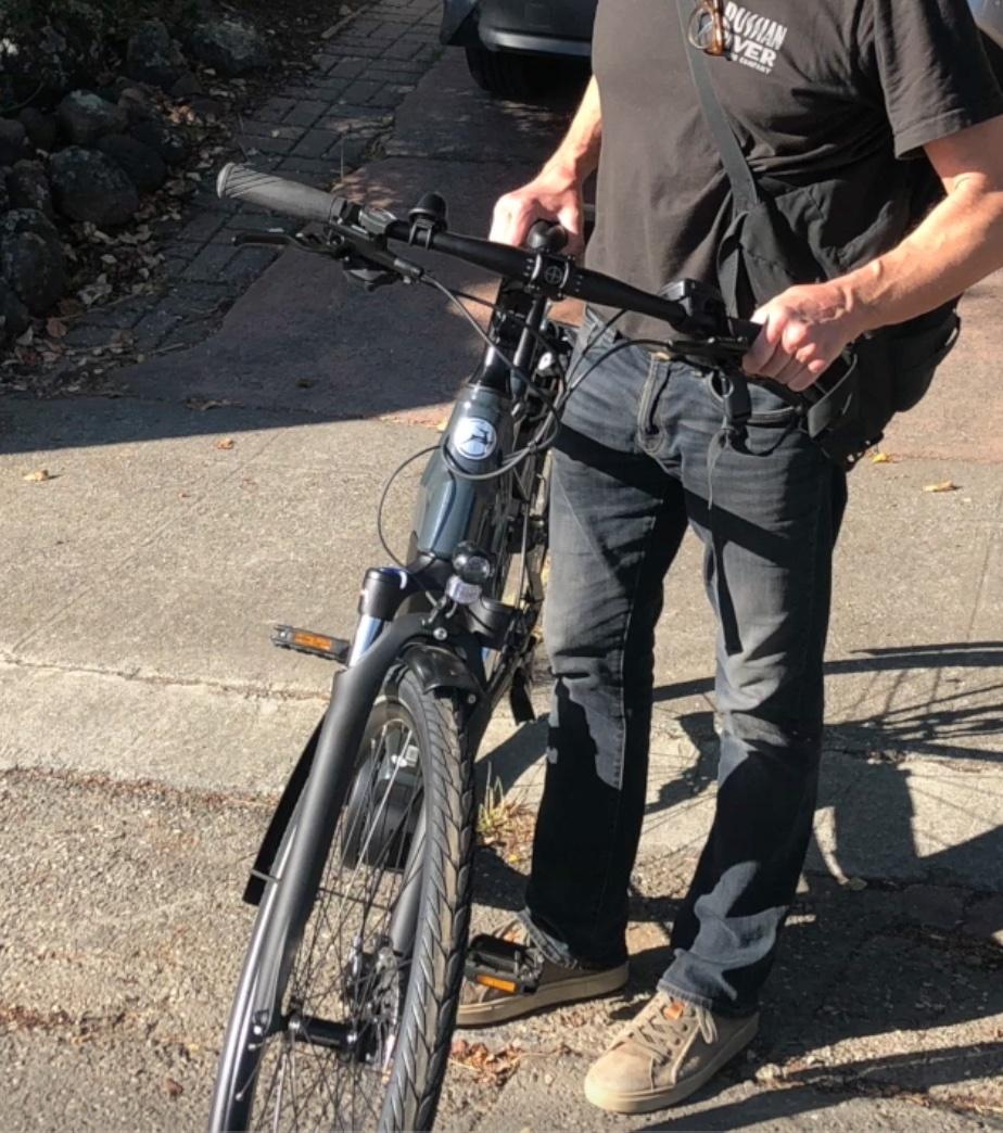 I double locked my ebike (engaged the rear wheel lock, and chained it to a looped bike rack) in front of the Ace Hardware at 4024 MacArthur Blvd. Oakland, CA, around 4:40pm, Friday, March 24, 2023. Upon exiting the store at 4:47pm I discovered my eBike missing from where I locked it. A security guard nearby, asked me if that was my bike, and said the guy who took it was behind the Citibank building across the street. I ran across the street towards Citibank, and saw a white pickup truck (with my bike in the bed) driving out of the Citibank parking lot, entering and turning left on MacArthur. The truck then turned left on 38th Avenue, and headed west, and was gone. A bystander took a photo of the truck, and sent it to me. The license plates were covered over with cardboard. I went back across the street to Ace Hardware, and the manager told me he had video of the incident. I viewed it, and took photos of a video of the crime. The guy who stole it was heavy set, about 5'-8 to 5'-9" tall, with an orange hoody, a white surgical mask, and maybe blue jeans. He cut my chain with a portable Grinder, and carried the bike across the street and out of the video frame.