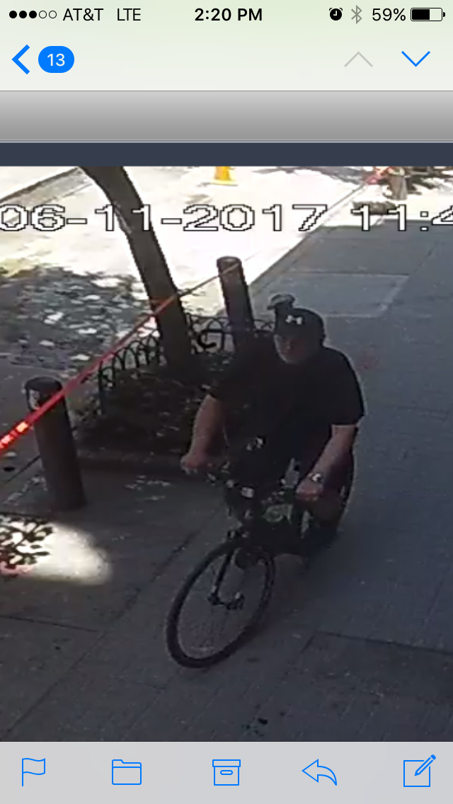 Man with silver beard and black baseball cap, walks up to both bikes, looks around, cuts it and rides off. Tapes from restaurant provided footage. 12.45pm on 11th June.