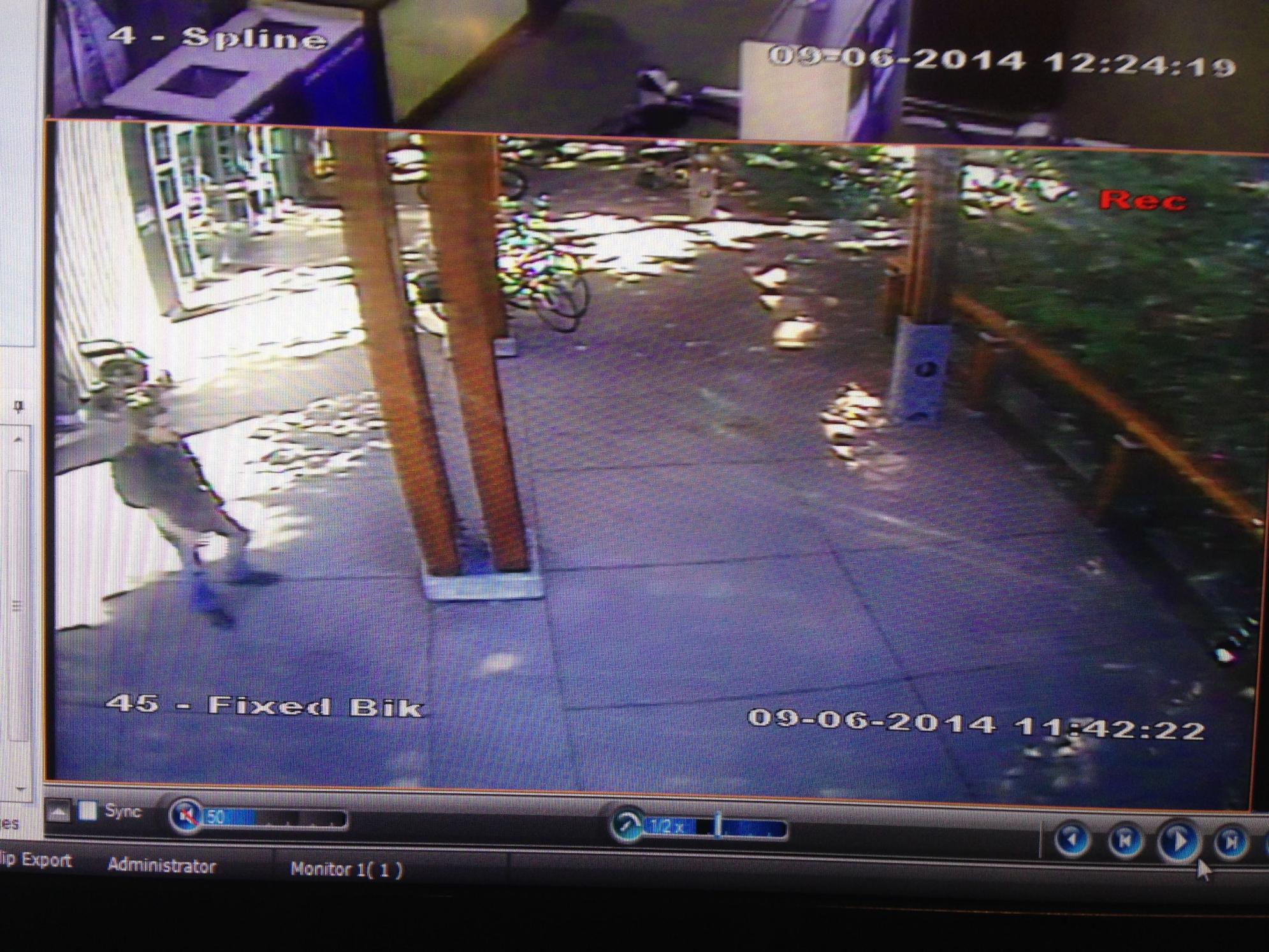 Security video shows white male with ponytail and black backpack taking bike