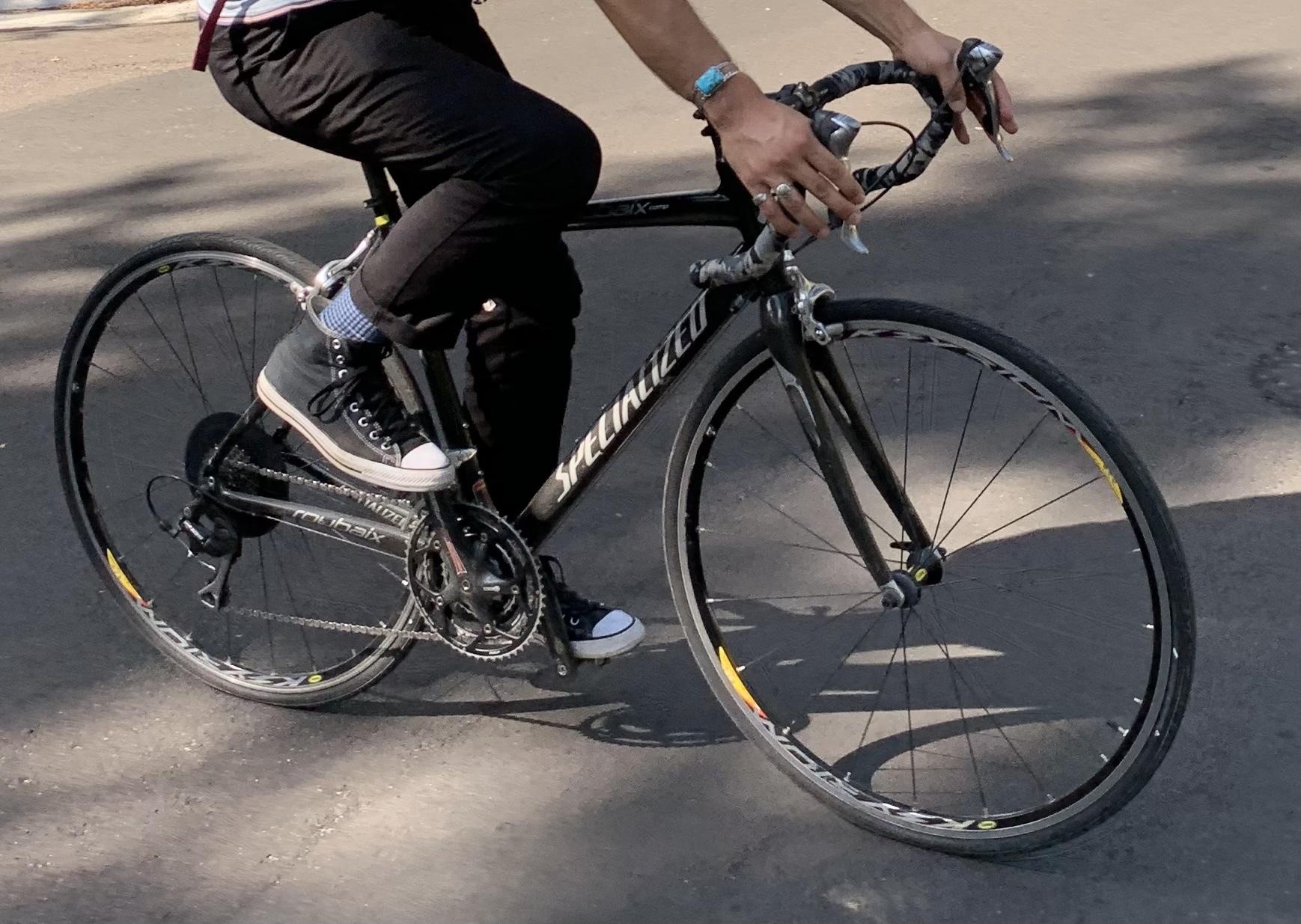 It is a black Specialized Roubaix road bike with silver lettering. The handlebars are curl down racer style with black/grey/white