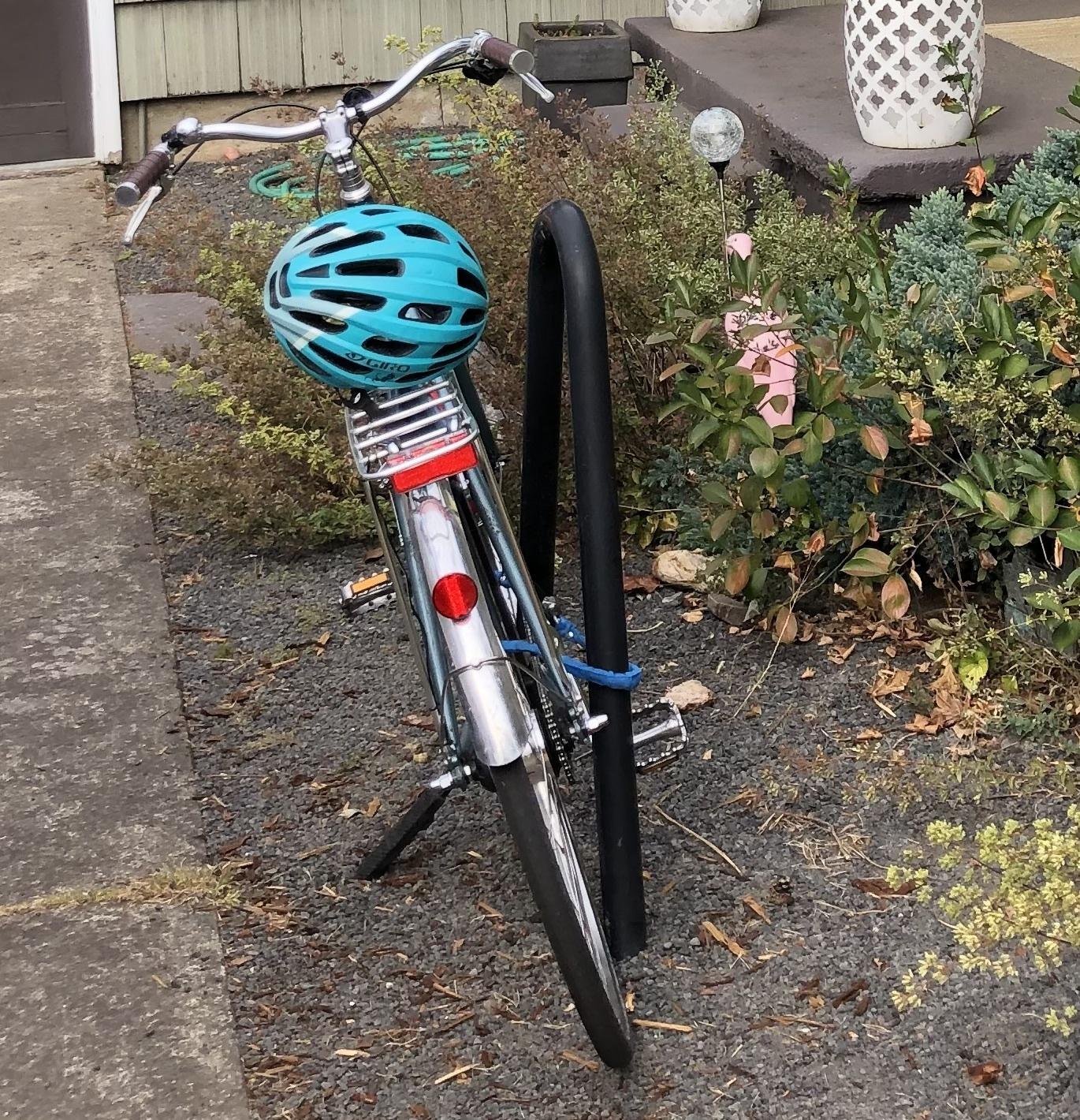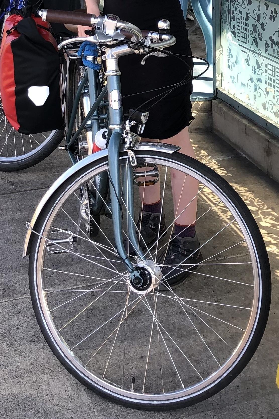 Parked at the bike racks at the north entrance to the Lloyd Center mall. Bike had a chain lock with combination, it was not found but the helmet was still there, so probably forgot to lock it. Stolen between 3:30pm and 6pm. We have the original reciept from Clever Cycles bike shop. Modifications from stock include front dynamo hub with a Union (dutch) front light, a rear B&M taillight connected by wire. The cog is slightly larger and the chainring is slightly smaller than stock (for lower gearing). Also note a Clever Cycles logo on the seat tube near the crank.