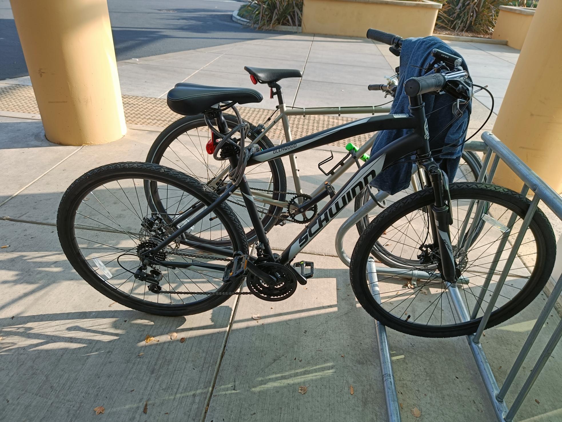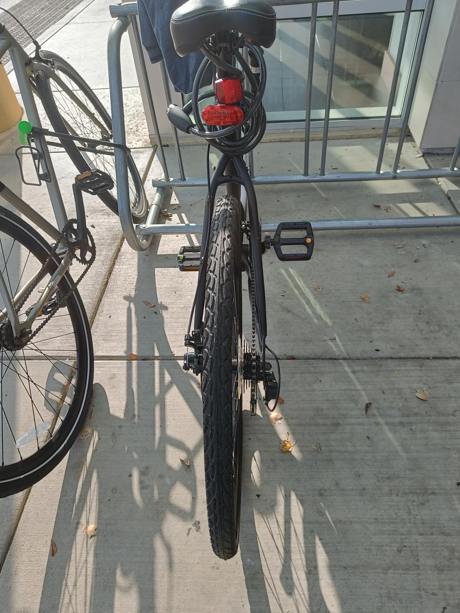 The bike was stolen in the parking space in front of Kleiber hall. The cable lock was taken and the frame of which the bike was locked to was bent and compromised.