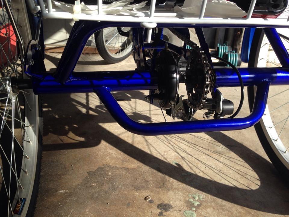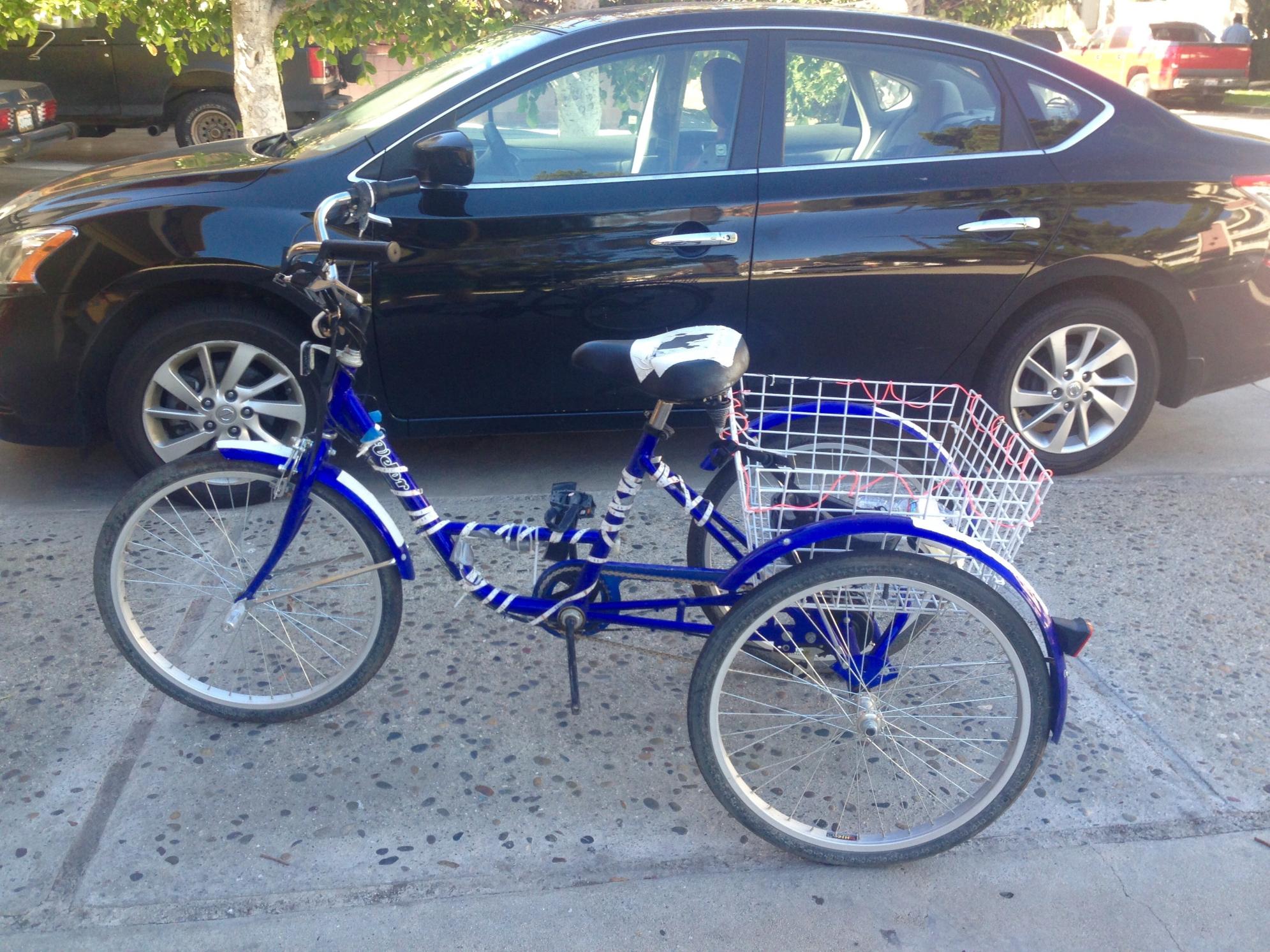Thieves jumped over a locked gate to enter the open air apartment complex and approached the tricycle locked under the stairs. The tricycle is not visible from the street or outside the complex. What appears to be a white man cut the lock and walked the tricycle out to the street. They were on foot.