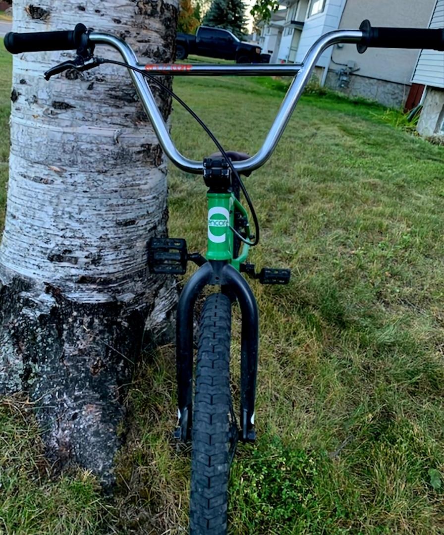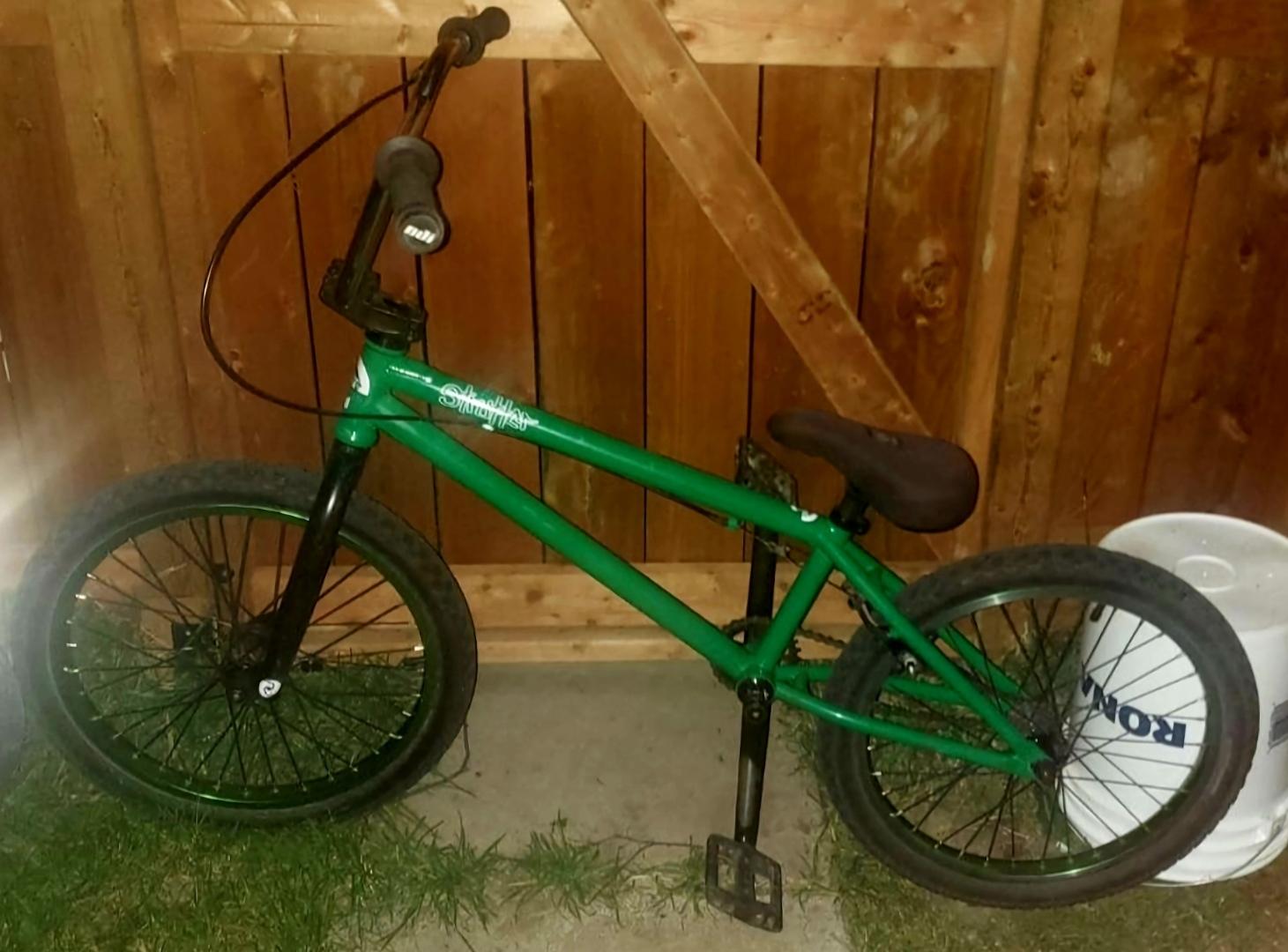 Bike was left outside, leaned against the house with another kids bike. There's wad a basketball hanging on the handlebar in a bag. The basketball was on the ground, and the other bike still in the same place in the morning