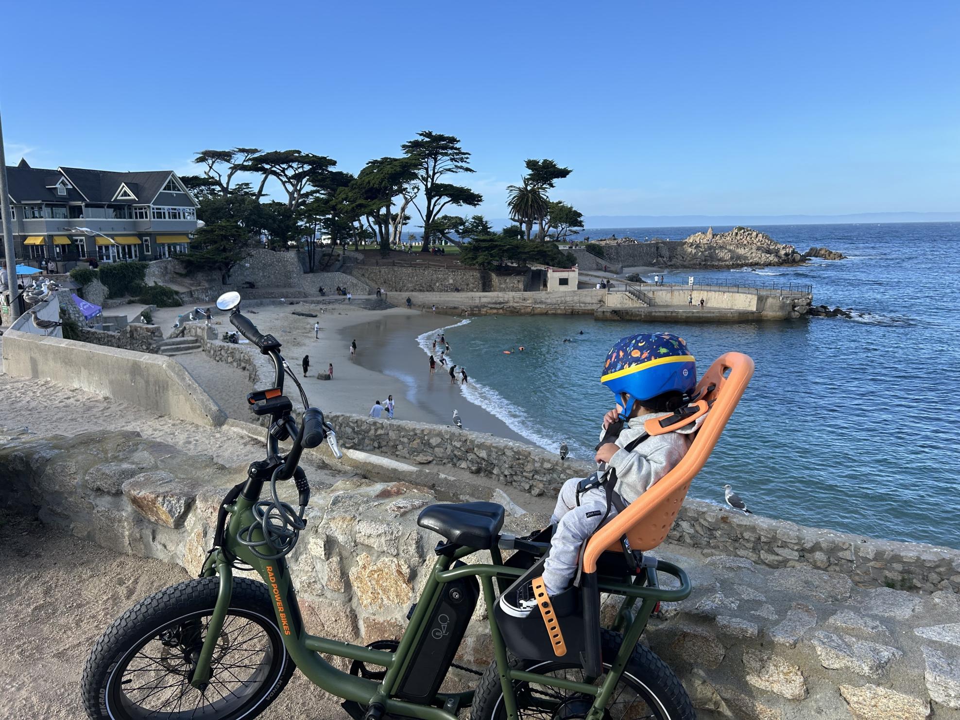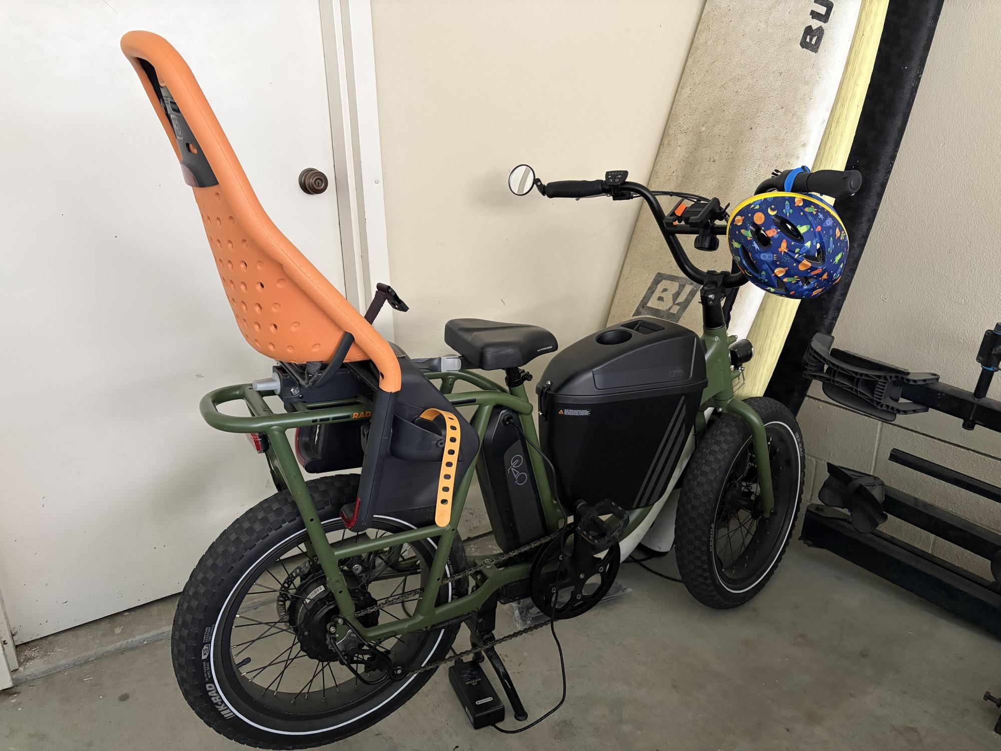 Taken from my apartment in Monterey California about 2 blocks from the famous bike path. Green bike, orange Thule child seat, a storage compartment in between the rider’s legs, mirror on the left mirror, and a phone mount on the handle bar.