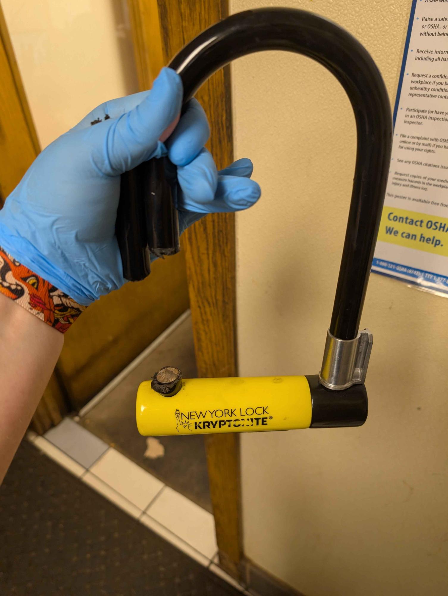 The thief cut my kryptonite lock rated 8/10 for safety in two minutes, then immediately escaped
