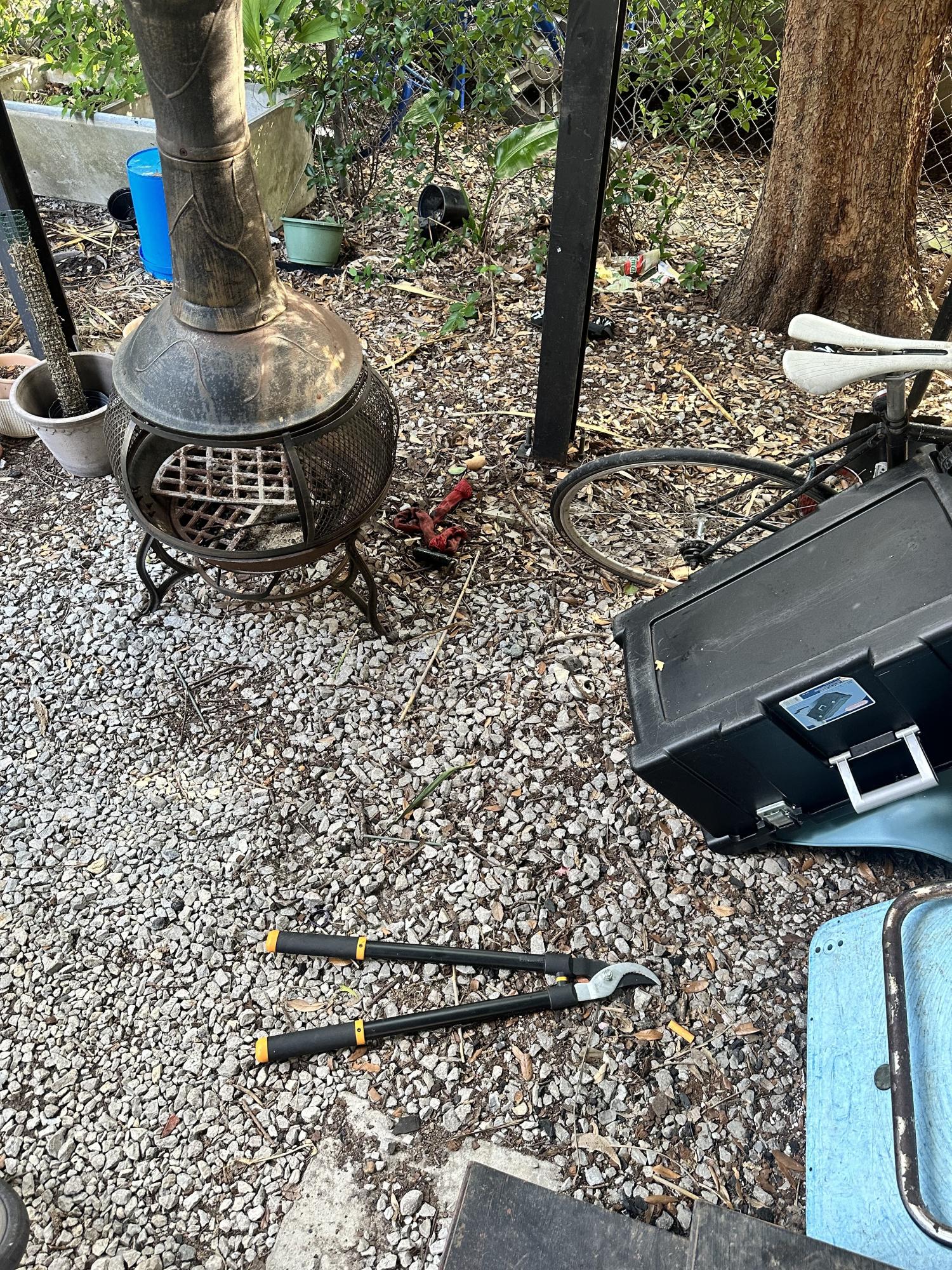 My bike was locked up to a large pole that supports my house. Some heavy duty shears were used and left at the scene.