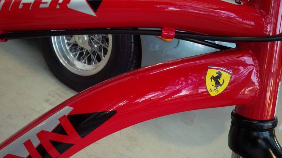 Red mountain bike Schwinn brand. With a basket on the front and a Ferrari sticker.