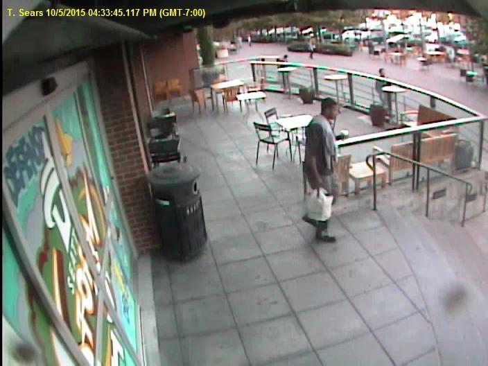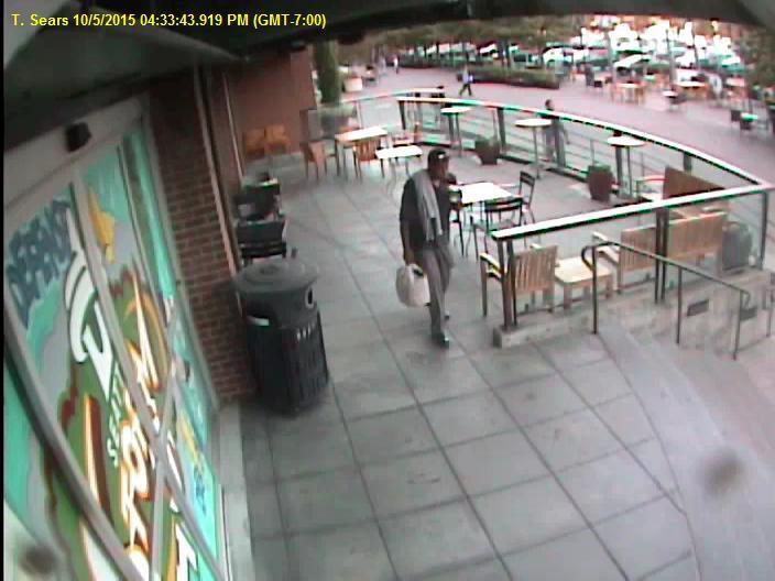 Man exited Starbucks (see photos of suspect) at 4:33pm, proceeded to the bicycle, checked the tire air pressure, cut the lock and rode north a very short distance around some chairs and turned south in the parking lot where he discarded the lock.