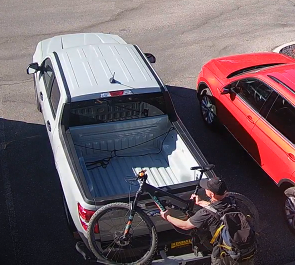 Bike was secured to the back of my vehicle using a Kuat cable lock. Vehicle was parked in place of employment parking lot in front of a security camera. A man entered the parking lot, cut the lock, and rode off within 90 seconds. This occurred on Mallard Dr, near Parkcenter Pond.
