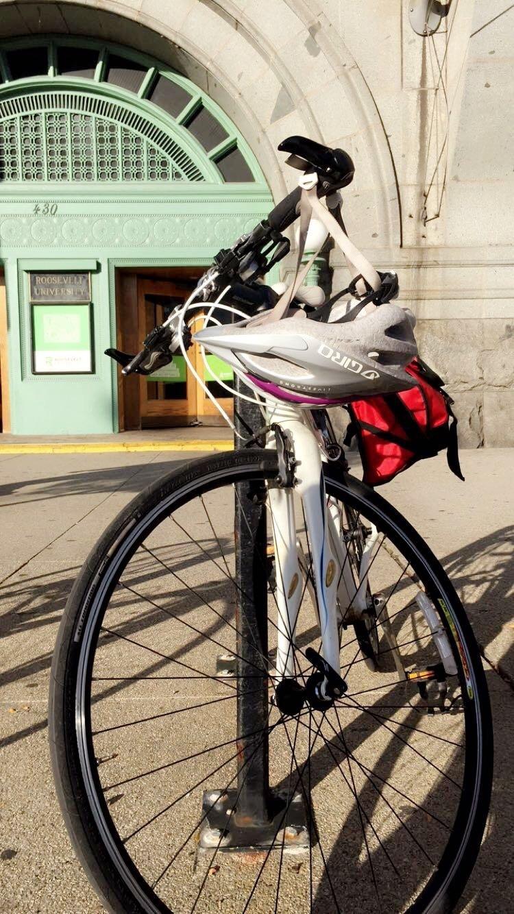 I biked to work (Roosevelt University) and parked my bike on the bike racks right out in front of the building on 430 S Michigan Avenue. I lock my bike through both wheels and the frame with a cable combination lock. I checked on it during my lunch break and my bike was still there at 1 pm, so it had to taken between 1 and 5 pm. The bike and lock were both missing when I came out to get it around 5 pm.