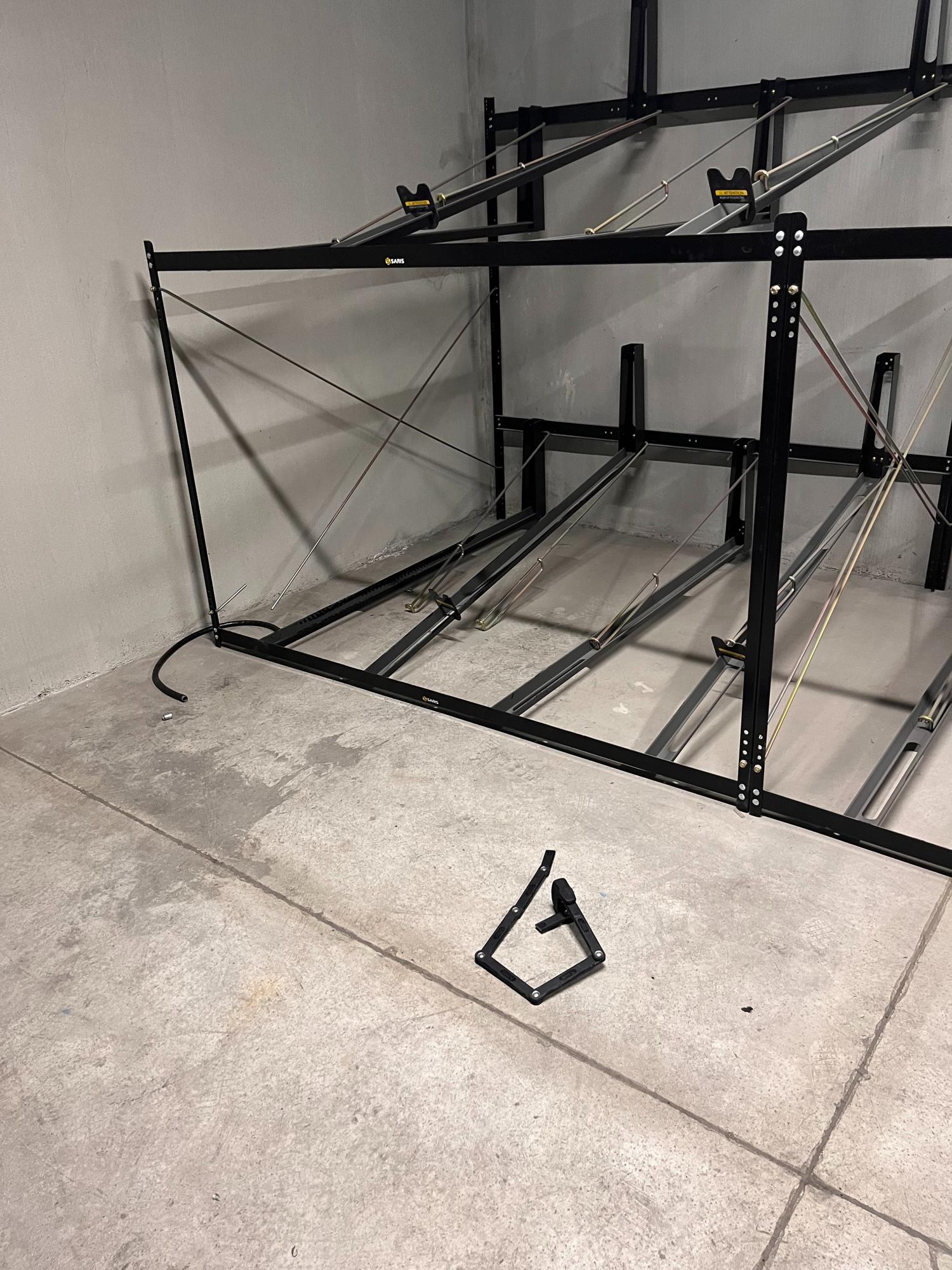 Locked bike room in underground garage of residential building. Bike was locked to rack with two locks.