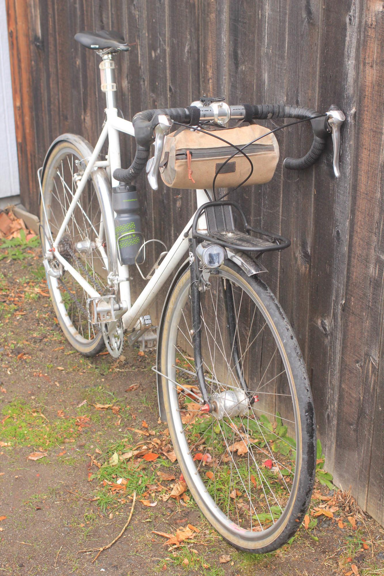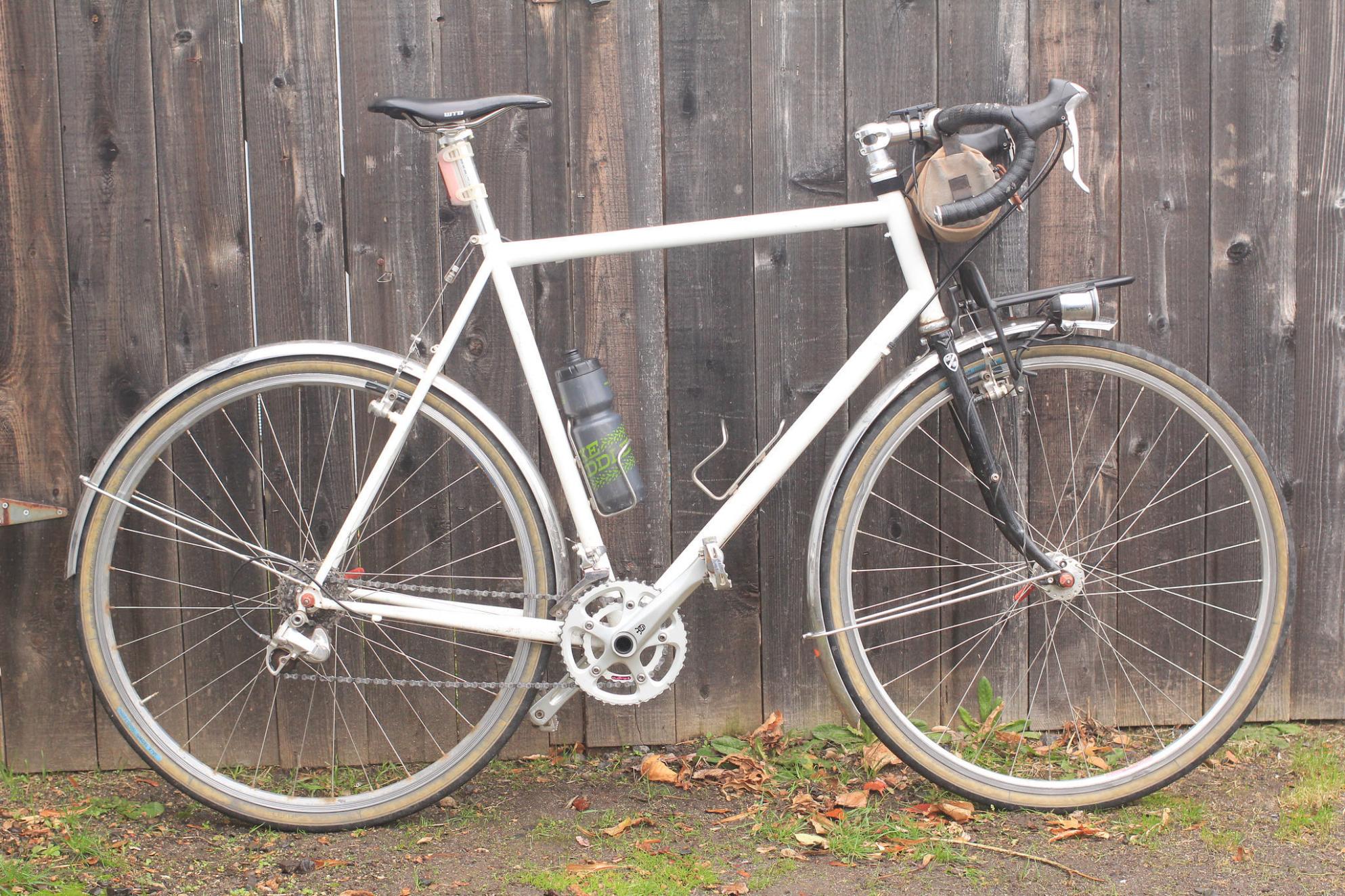 Bike was locked to another bike on a hitch rack attached to our white 2001 Subaru Impreza Outback Sport which was stolen around 11:15 a.m. from outside the Gresham Goodwill. The Desalvo has no decals with the exception of the word "cotton" on the non-drive side top tube. The bike has a Son dyno front hub, silver Velo Orange fenders, a front rack with a basket attached to it. Silver Thomson stem and seat post.