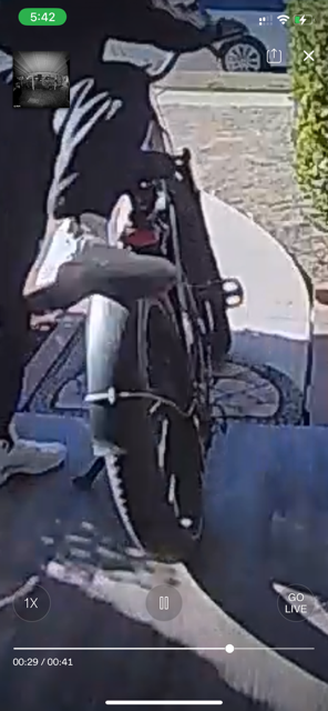 It was taken by an African American Male with a black onesie sweatsuit / hoodie on, however you can see his entire face. He got out of a blue or grey Kia and the driver stayed in the car until he road off with the bike and then followed him. The camera was too blurry to get the license plate.