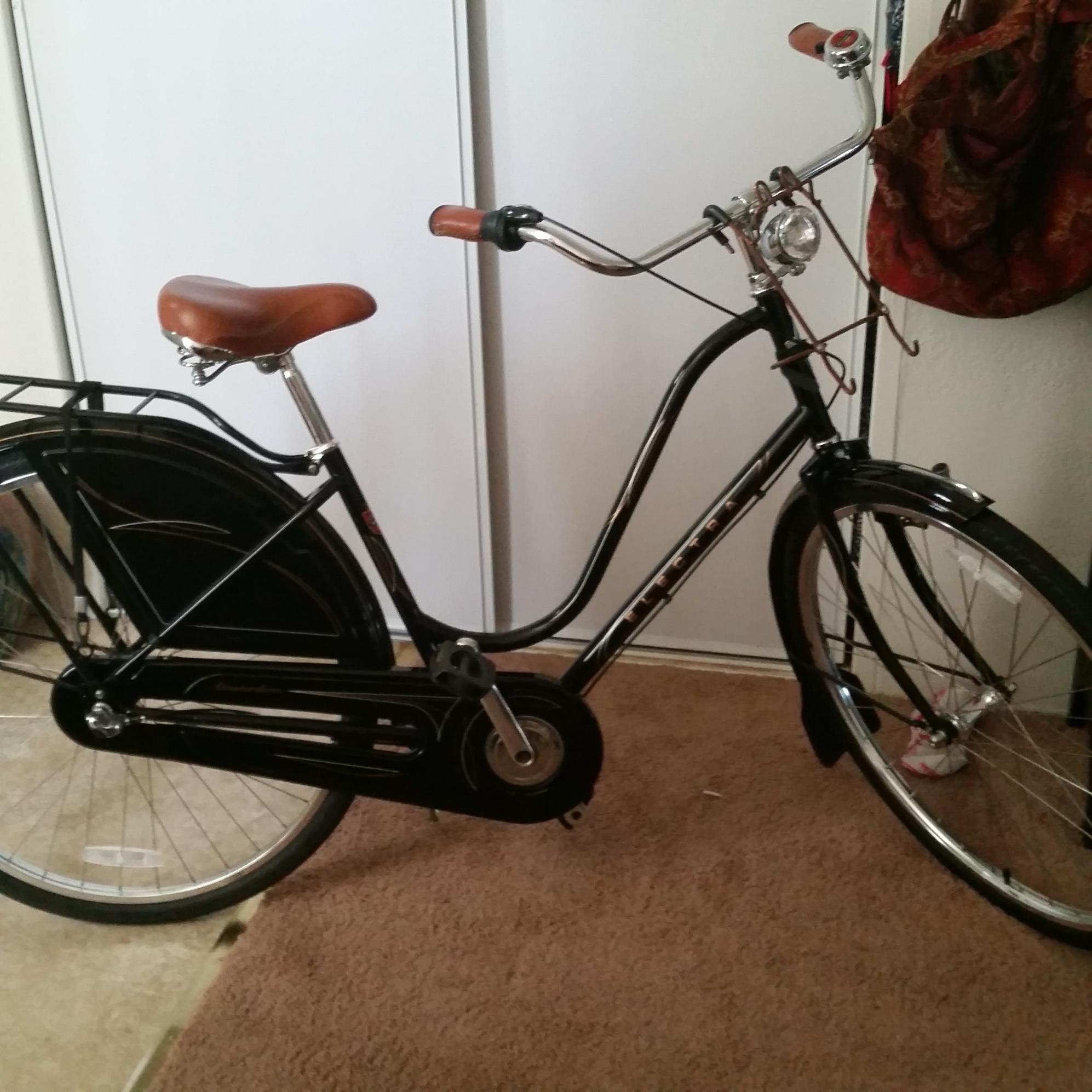 Black electra amsterdam 3 speed with brown basket and two green military bags on either side. I'm willing to give a reward to anyone that can find it for me. It's a 2012 model dutch style frame.