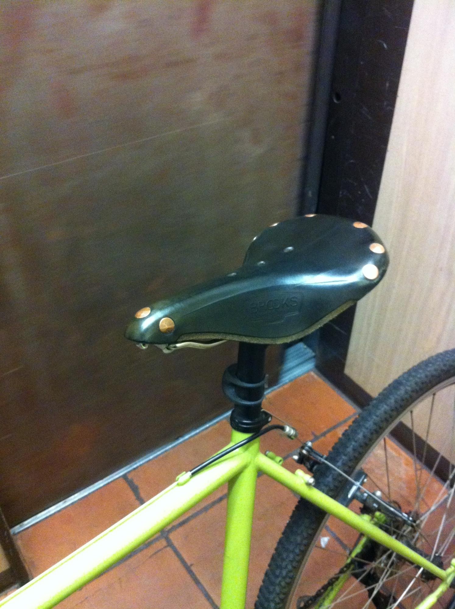 Kryptonite lock cut from rack in parking garage in my building. Green (looks black) Brooks saddle with copper rivets.