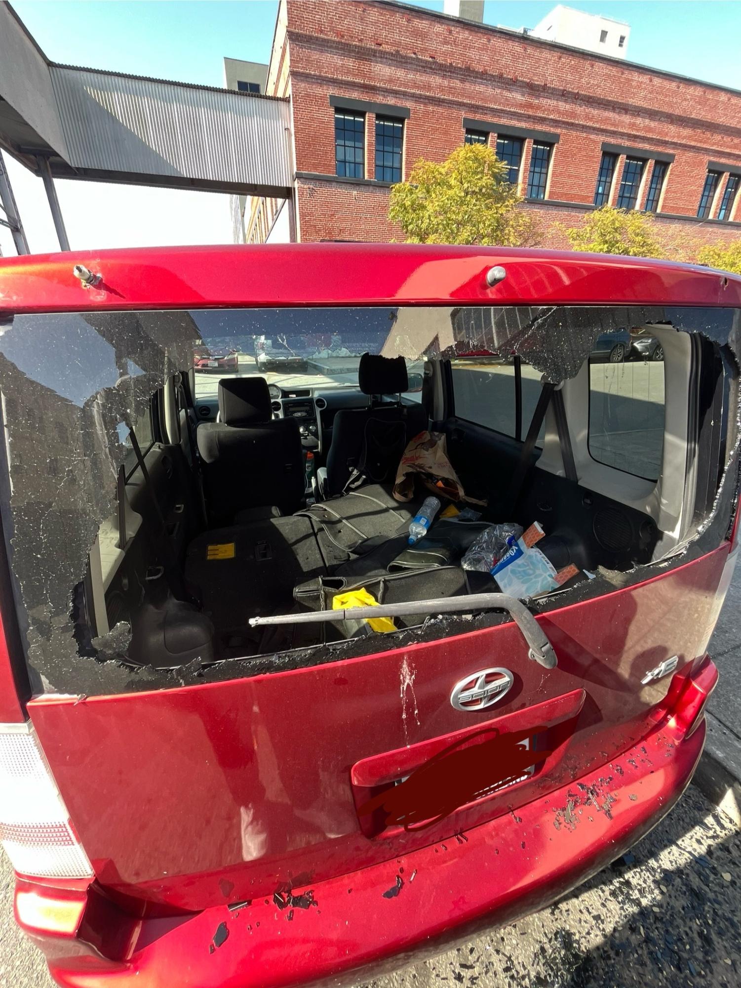 The bicycle was in my red Scion XB car while I went to buy a part for the bicycle. When I come back, I see the rear windshield shattered and bicycle was not there any more. I parked right under where the camera is from USPS. There is an alley at the corner of 15th and Florida st