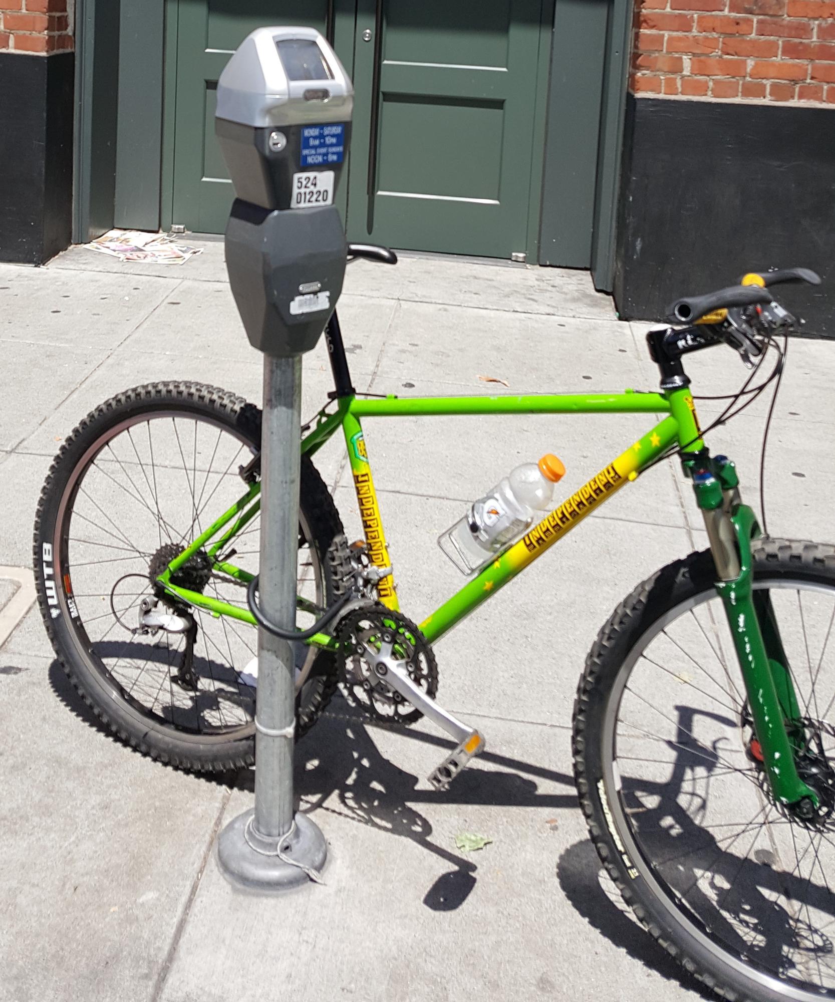 I was parked in front of Cooperstown S.F. Exhibit on King street with no parking behind me. I was in the immediate area for approximately 45 minutes at 11 AM Sunday July 3rd. My bike was locked to my Yakima bike rack. Cables and bike rack were cut. The thief that stole my bike left their bike locked to the parking meter I was parked at. I have included a picture of the thief's bike.