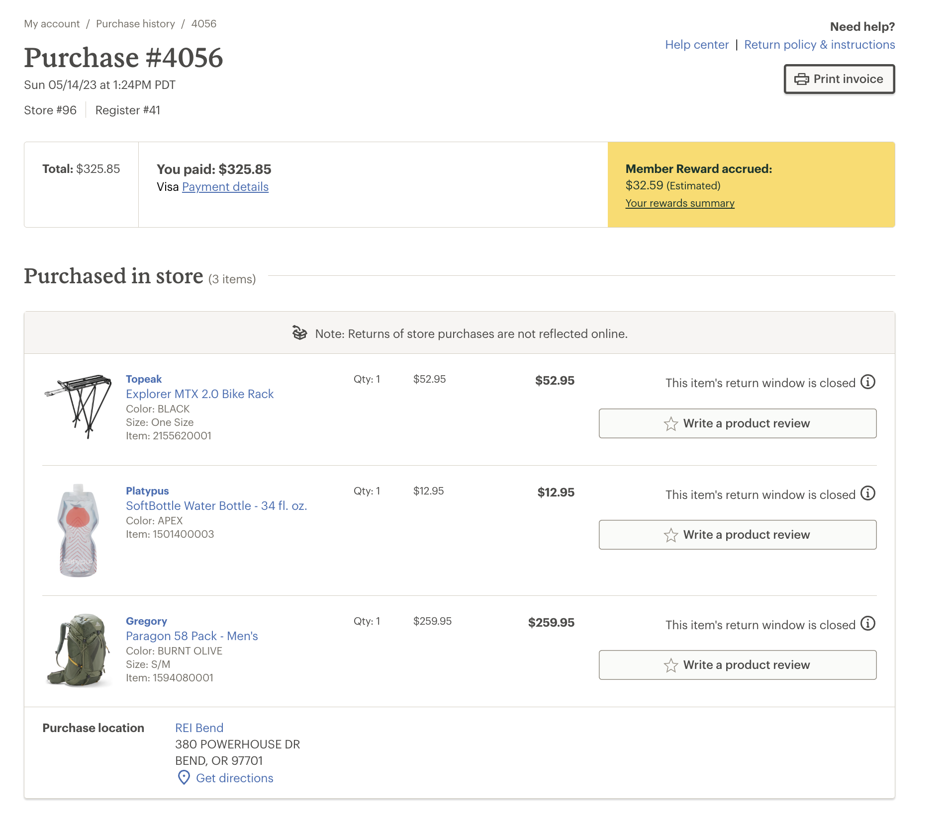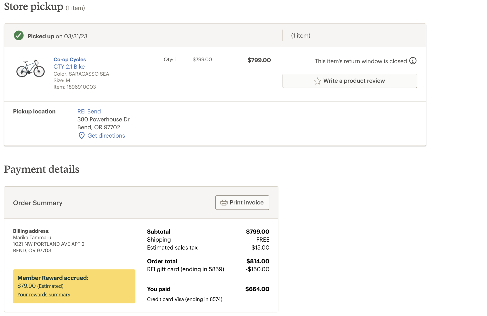 multi tool, a bike pump, and a baseball hat. The bike was a blue Co-op CTY 2.1 bike with a rear rack and stickers that say 'Bend Bikes' and 'Safe Routes to School'. An employee at Glass House said they noticed the bike missing its front tire when they arrived at work at 5:00AM on 5/28. I am the original purchaser of the bike.