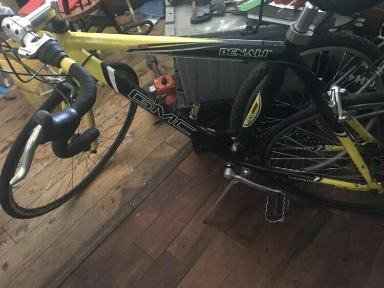 Bicycle was changed in the backyard on a water pipe back side of the house